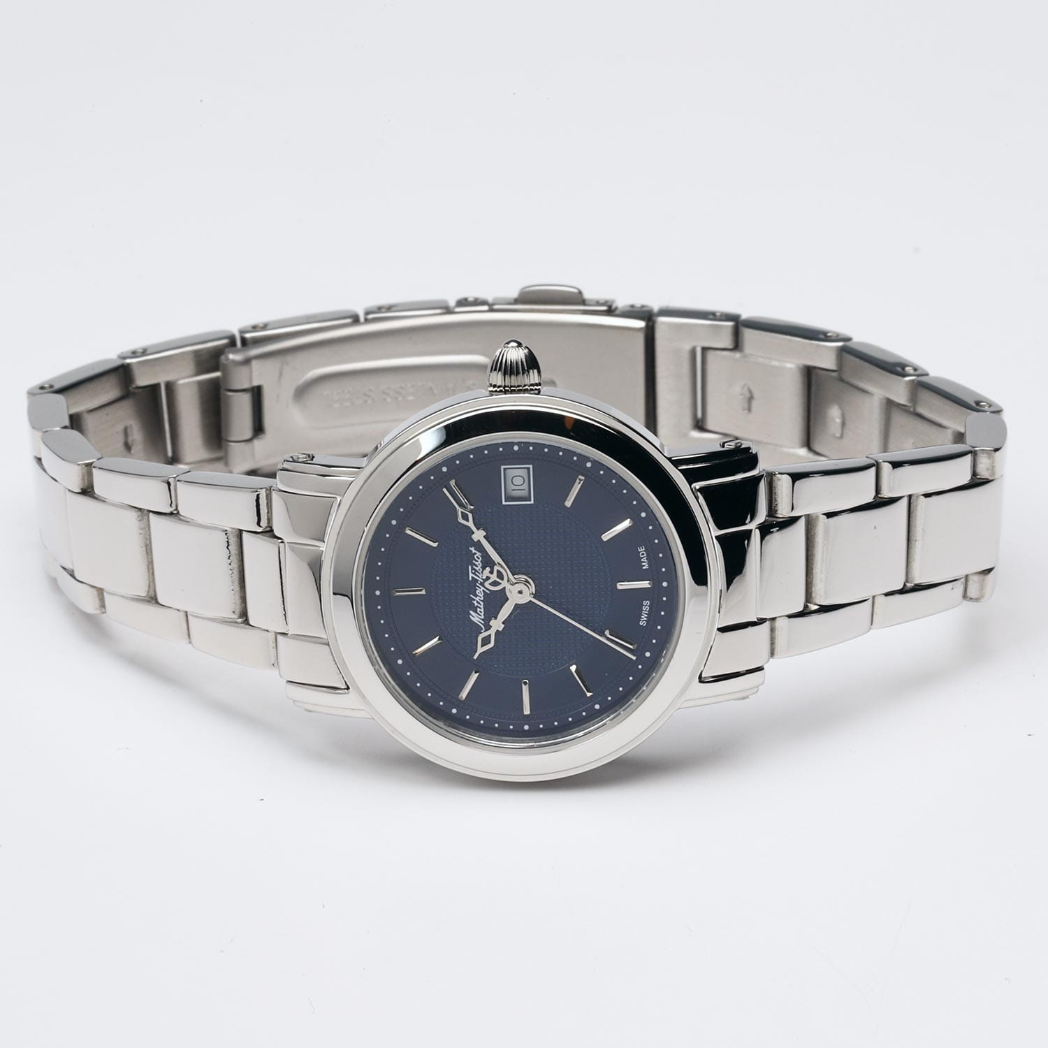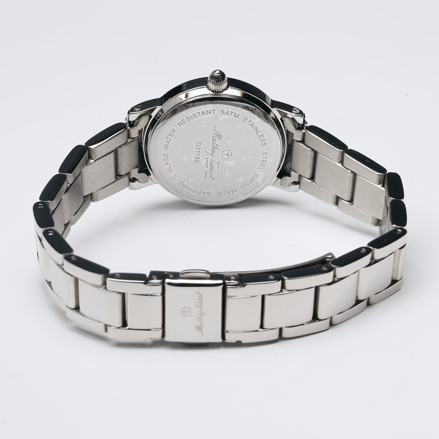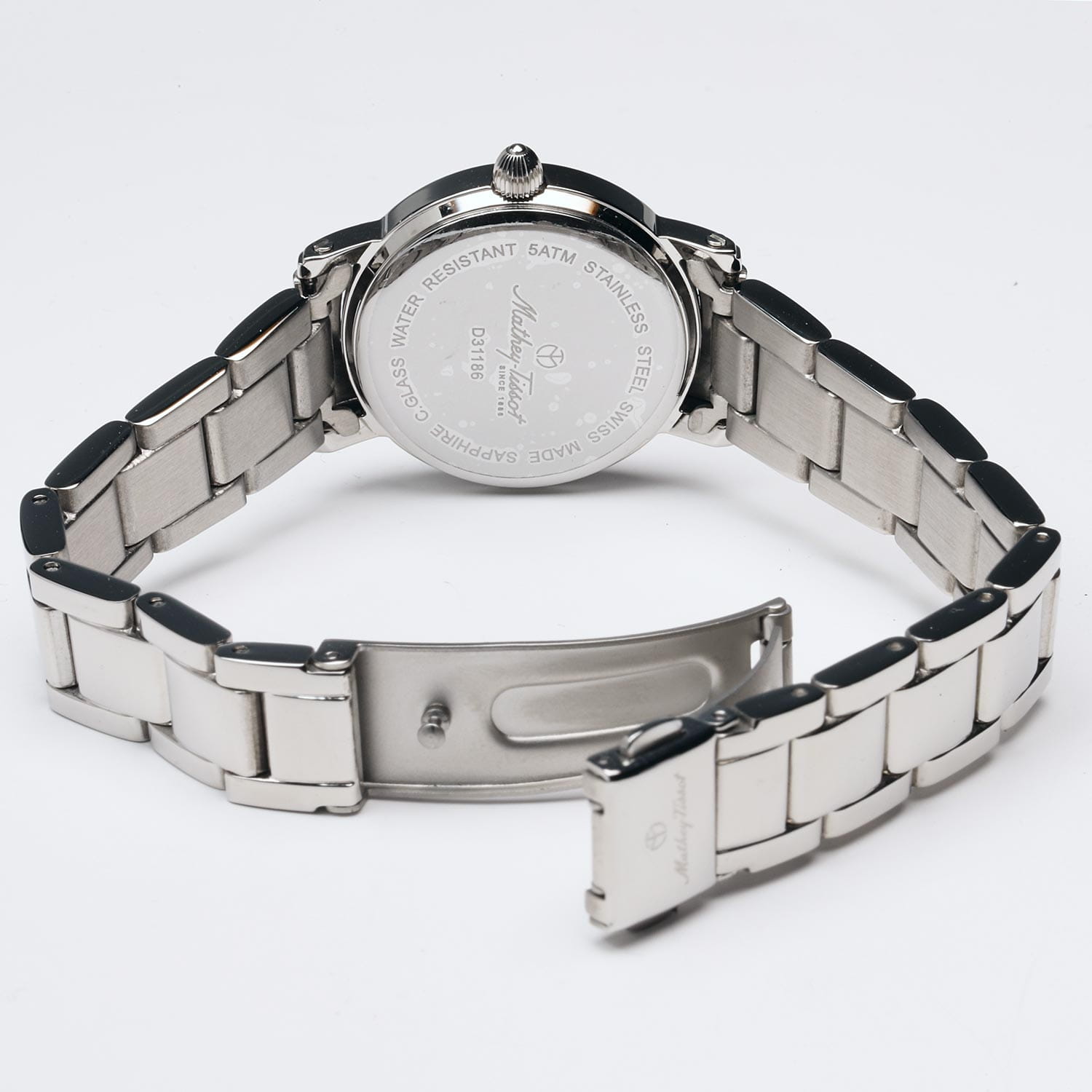 Женские кварцевые часы Mathey-Tissot City Metal D31186MABU — это стильное сочетание элегантности и современного дизайна. Изящный корпус выполнен из нержавеющей стали 316L, что придаст образу женственности и романтизма. Изысканный циферблат с метками в виде штрихов придает модели особый блеск. Циферблат защищен минеральным стекломМинеральное стеклоМинеральное стекло представляет собой искусственно выращенный минерал кварца. Такое стекло отличается особой устойчивостью к повреждениям и царапинам. Уступает по некоторым качествам сапфировому стеклу. с сапфировым покрытием, обеспечивает устойчивость к царапинам. Окошко даты находится в положении 3 часов. Часы оснащены надежным кварцевым механизмом. Стальной браслет на раскладной застёжкеРаскладная застёжкаТакой тип застёжки используется только на браслетах из металла. Она никогда не раскрывается полностью, происходит разделение на 2 и более частей. Раскладывающая застёжка снизит вероятность потери часов к минимуму., гарантирует комфортное и безопасное ношение. Класс водозащиты: 50 метров позволит защитить корпус от случайных брызг или капель дождя. Mathey-Tissot  — отличный выбор для тех, кто ценит утонченность и качество.