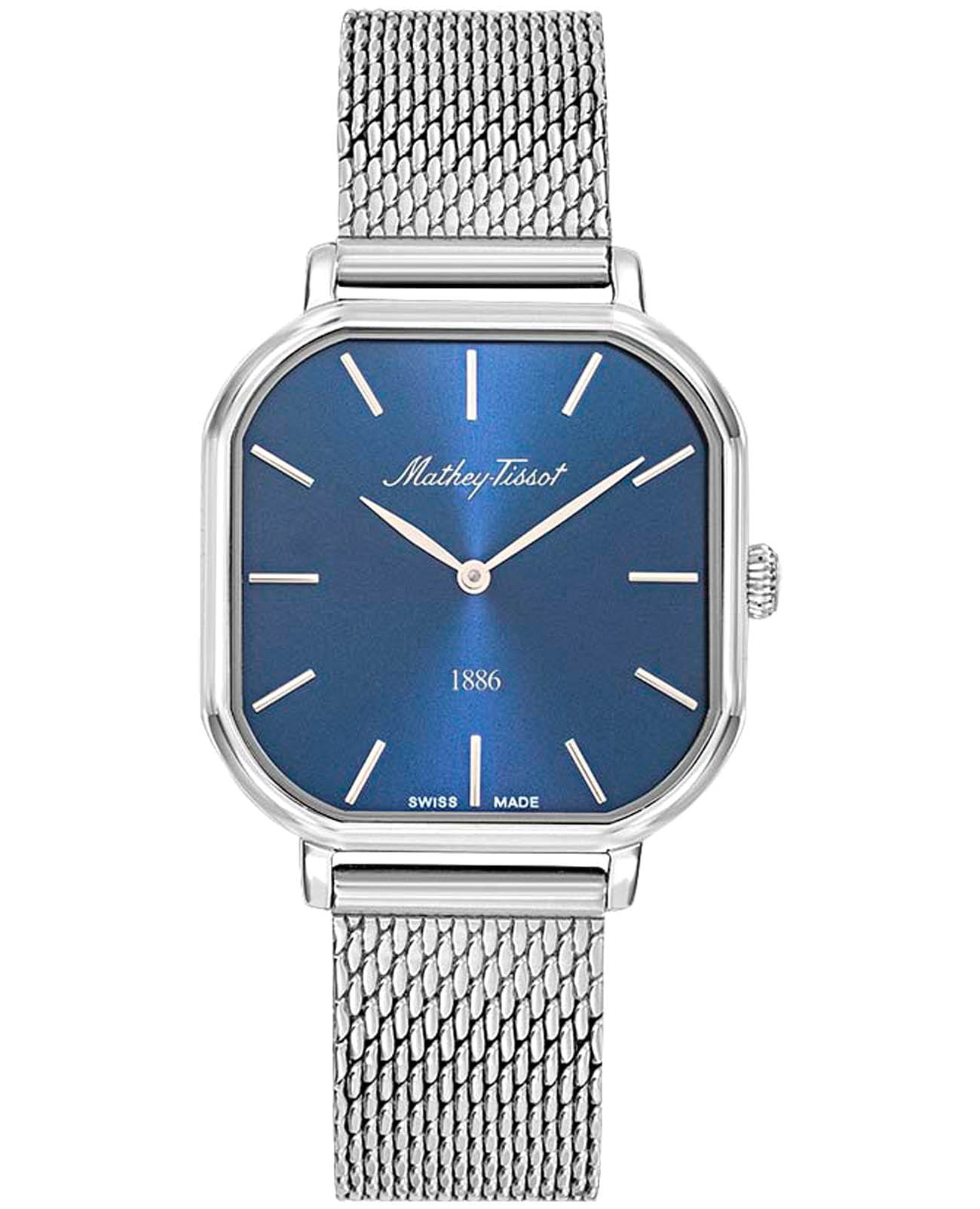 Женские кварцевые часы Mathey-Tissot Monsoon D7917ABU — это стильное сочетание элегантности и современного дизайна. Изящный корпус выполнен из нержавеющей стали серебристого цвета, размером 32х32 мм, что придаст образу элегантности и надежности. Изысканный циферблат с метками в виде штрихов придает модели особый блеск. Циферблат выполнен по технологии Sunray (солнечные лучи) и защищен минеральным стекломМинеральное стеклоМинеральное стекло представляет собой искусственно выращенный минерал кварца. Такое стекло отличается особой устойчивостью к повреждениям и царапинам. Уступает по некоторым качествам сапфировому стеклу. с сапфировым покрытием, обеспечивает устойчивость к царапинам. Часы оснащены надежным кварцевым механизмом. Стальной браслет миланского плетения на раскладном замкеРаскладная застёжкаТакой тип застёжки используется только на браслетах из металла. Она никогда не раскрывается полностью, происходит разделение на 2 и более частей. Раскладывающая застёжка снизит вероятность потери часов к минимуму., гарантирует комфортное и безопасное ношение. Класс водозащиты: 50 метров позволит защитить корпус от случайных брызг или капель дождя. Mathey-Tissot — отличный выбор для тех, кто ценит утонченность и качество.