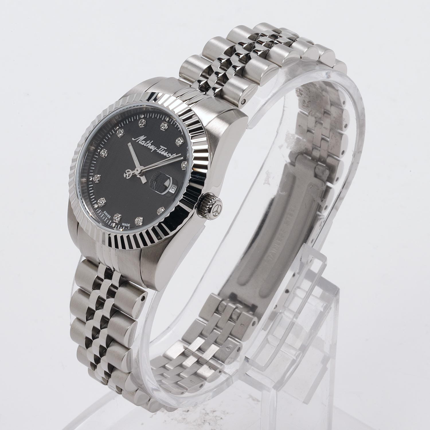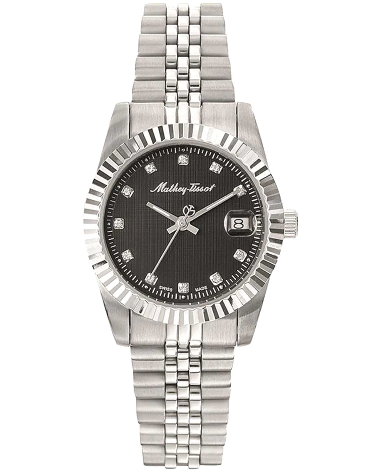 Женские кварцевые часы Mathey-Tissot Rolly D810AN — это стильное сочетание элегантности и современного дизайна. Изящный корпус выполнен из нержавеющей стали, диаметром 30 мм, что придаст образу женственности и романтизма. Изысканный циферблат с метками в виде точек придает модели особый блеск. Циферблат защищен минеральным стекломМинеральное стеклоМинеральное стекло представляет собой искусственно выращенный минерал кварца. Такое стекло отличается особой устойчивостью к повреждениям и царапинам. Уступает по некоторым качествам сапфировому стеклу., обеспечивающий устойчивость к царапинам. Стрелки с люминесцентным покрытиемЛюминесцентное покрытиеПозволяет считывать показания времени в темноте. Производители наносят на стрелки, часовые индексы, безель или поверхность циферблата светонакопительный состав, дающий холодное свечение.. Рифленый безельБезельВнешний ободок, закрепляющий стекло. В спортивных часах так называется поворотное кольцо с делениями на циферблате, выполняет роль таймера – замеряет отрезки времени на шкале. Неподвижный безель – элемент декора. Однонаправленно вращающийся безель на дайверских часах позволяет фиксировать моменты погружения и выныривания на поверхность. серебристого цвета. Циферблат украшен кристаллами. Окошко даты находится в положении 3 часа. Часы оснащены надежным кварцевым механизмом. Стальной браслет на раскладной застёжкеРаскладная застёжкаТакой тип застёжки используется только на браслетах из металла. Она никогда не раскрывается полностью, происходит разделение на 2 и более частей. Раскладывающая застёжка снизит вероятность потери часов к минимуму., гарантирует комфортное и безопасное ношение. Класс водозащиты: 50 метров позволит защитить корпус от случайных брызг или капель дождя. Mathey-Tissot  — отличный выбор для тех, кто ценит утонченность и качество.