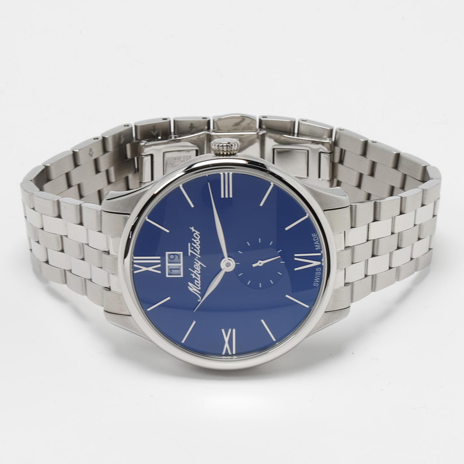 Мужские кварцевые часы Mathey-Tissot Edmond Metal H1886MABU — это стильное сочетание элегантности и современного дизайна. Изящный корпус выполнен из нержавеющей стали, диаметром 42 мм, что придаст образу элегантности и надежности. Изысканный циферблат с метками в виде штрихов и римских цифр придает модели особый блеск. Циферблат защищен минеральным стекломМинеральное стеклоМинеральное стекло представляет собой искусственно выращенный минерал кварца. Такое стекло отличается особой устойчивостью к повреждениям и царапинам. Уступает по некоторым качествам сапфировому стеклу. с сапфировым покрытием, обеспечивает устойчивость к царапинам. Окошко даты находится в положении 12 часов. Стальной браслет на застёжке-бабочке с кнопкамиЗастёжка "бабочка"Такой вид застёжки дополняется предохранителями, помогающими избежать случайного раскрытия браслета. Обладают изящным исполнением. , гарантирует комфортное и безопасное ношение. Секундная стрелка вынесена на отдельный циферблат. Рифленая заводная головка. Класс водозащиты: 50 метров позволит защитить корпус от случайных брызг или капель дождя. Mathey-Tissot  — отличный выбор для тех, кто ценит утонченность и качество.