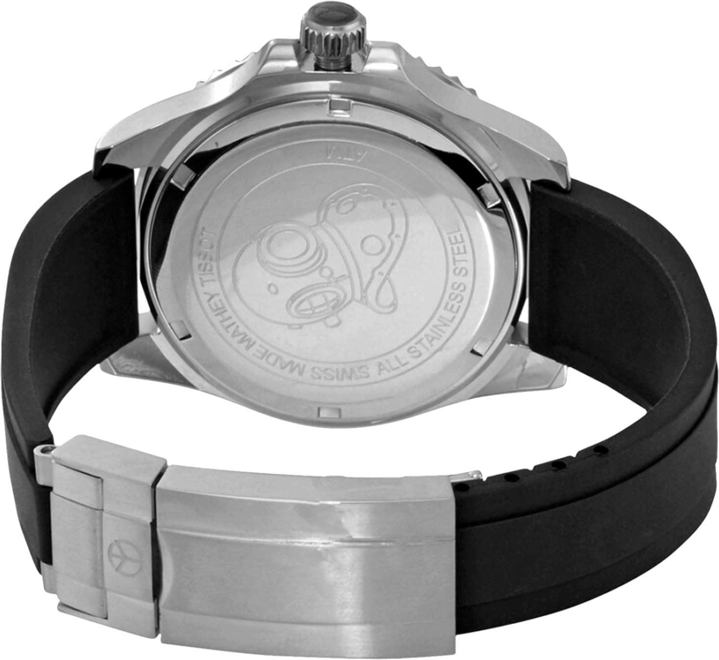 Мужские кварцевые часы Mathey-Tissot Mathy H909ABU— это стильное сочетание элегантности и современного дизайна. Изящный корпус выполнен из нержавеющей стали, диаметром 42 мм, что придаст образу элегантности и надежности. Циферблат с метками в виде точек и арабских цифр придает модели особый блеск. Циферблат защищен минеральным стекломМинеральное стеклоМинеральное стекло представляет собой искусственно выращенный минерал кварца. Такое стекло отличается особой устойчивостью к повреждениям и царапинам. Уступает по некоторым качествам сапфировому стеклу. с сапфировым покрытием, обеспечивает устойчивость к царапинам. Стрелки и метки с люминесцентным покрытиемЛюминесцентное покрытиеПозволяет считывать показания времени в темноте. Производители наносят на стрелки, часовые индексы, безель или поверхность циферблата светонакопительный состав, дающий холодное свечение.. Окошко даты находится в положении 3 часа. Вращающийся безельБезельВнешний ободок, закрепляющий стекло. В спортивных часах так называется поворотное кольцо с делениями на циферблате, выполняет роль таймера – замеряет отрезки времени на шкале. Неподвижный безель – элемент декора. Однонаправленно вращающийся безель на дайверских часах позволяет фиксировать моменты погружения и выныривания на поверхность. в одном направлении. Часы оснащены надежным кварцевым механизмом. Силиконовый ремешок с раскладной застёжкойРаскладная застёжкаТакой тип застёжки используется только на браслетах из металла. Она никогда не раскрывается полностью, происходит разделение на 2 и более частей. Раскладывающая застёжка снизит вероятность потери часов к минимуму. гарантирует комфортное и безопасное ношение. Класс водозащиты: 200 метров позволит плавать, нырять и заниматься другими водными видами спорта. Mathey-Tissot — отличный выбор для тех, кто ценит утонченность и качество.