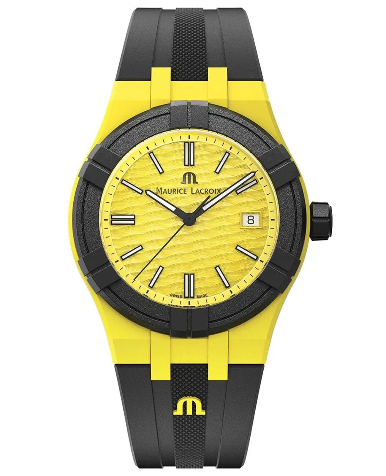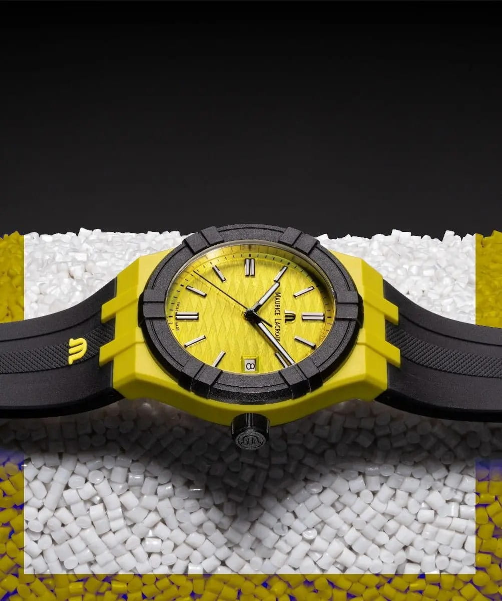 Часы AIKON #tide обладают всеми преимуществами AIKON, но кроме того, они выполнены из особого материала под названием #tideocean – переработанного океанского пластика, усиленного стекловолокном. В результате сложного технологического процесса переработки получен композитный материал, вдвое превосходящий по прочности обычный пластик. Износостойкость композита #tideocean в пять раз выше полиэтилентерефталата (ПЭТ). И еще немаловажный экологический фактор – в процессе превращения океанского пластика в материал #tideocean углеродные выбросы в атмосферу значительно снижаются, чем при обычном процессе выпуска первичного пластика. В новой модели безельБезельВнешний ободок, закрепляющий стекло. В спортивных часах так называется поворотное кольцо с делениями на циферблате, выполняет роль таймера – замеряет отрезки времени на шкале. Неподвижный безель – элемент декора. Однонаправленно вращающийся безель на дайверских часах позволяет фиксировать моменты погружения и выныривания на поверхность., корпус, задняя крышка, заводная головка, наконечник и застежка выполнены из композитного материала #tideocean. 17 пластиковых бутылок требуется для производства одних отличных часов и их специальной упаковки, также на 100% состоящей из материала #tide, появившегося в результате отходов пластика в океане. В результате такой переработки выигрывают все. Мужские швейцарские кварцевые часы Maurice Lacroix Aikon Quartz AI2008-60060-300-0. Сапфировое стеклоСапфировое стеклоПрочный и надёжный материал из кристалла сапфира синтетического происхождения, характеризующийся особой твёрдостью и устойчивостью к царапинам и повреждениям. устойчивое к появлению царапин, обладающее высокой прозрачностью. Желтый циферблат. Стрелки и метки с люминесцентным покрытиемЛюминесцентное покрытиеПозволяет считывать показания времени в темноте. Производители наносят на стрелки, часовые индексы, безель или поверхность циферблата светонакопительный состав, дающий холодное свечение.. Класс водозащиты: 100 метров, позволит плавать, нырять и заниматься другими водными видами спорта. Окошко даты находится в положении 3 часов. Циферблат с тематическим гильошированием "Vagues du Jura". Корпус выполнен из переработанного пластика, ранее загрязнявшего Мировой океан. Каучуковый ремешок с классической застежкой.
