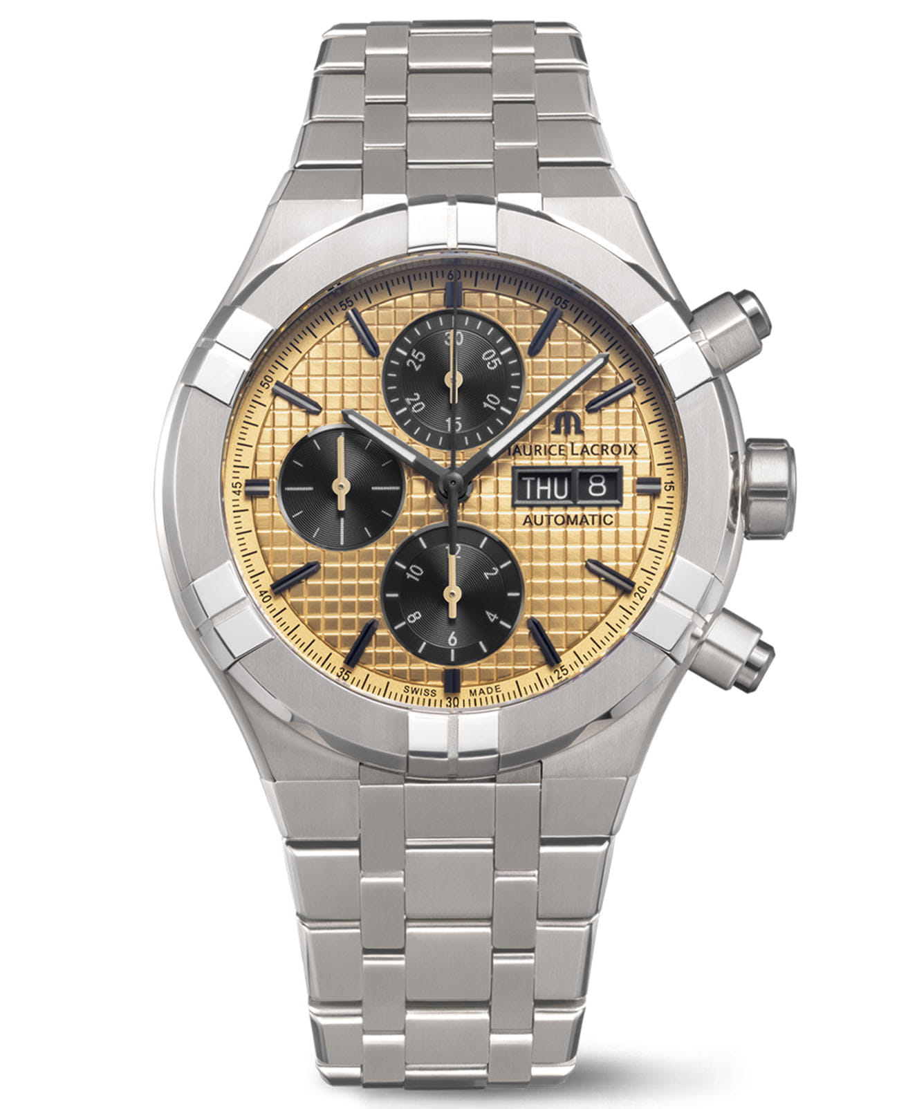 Женские кварцевые часы Maurice Lacroix Aikon Automatic Titanium AI6038-TT032-530-1 хронографХронографФункция позволяет измерять отрезки времени с особой точностью: часы, минуты, секунды. Верным признаком хронографа является наличие на циферблате 3 дополнительных окошек-счётчиков.. Корпус часов изготовлен из титана. Сапфировое стеклоСапфировое стеклоПрочный и надёжный материал из кристалла сапфира синтетического происхождения, характеризующийся особой твёрдостью и устойчивостью к царапинам и повреждениям. устойчивое к появлению царапин, обладающее высокой прозрачностью. Класс водозащиты: 200 метров, позволит плавать, нырять и заниматься другими водными видами спорта. Стрелки с люминесцентным покрытиемЛюминесцентное покрытиеПозволяет считывать показания времени в темноте. Производители наносят на стрелки, часовые индексы, безель или поверхность циферблата светонакопительный состав, дающий холодное свечение.. Титановый браслет и застёжка «бабочка» с кнопкамиЗастёжка "бабочка"Такой вид застёжки дополняется предохранителями, помогающими избежать случайного раскрытия браслета. Обладают изящным исполнением. . Окошко даты в положении 3 часа.