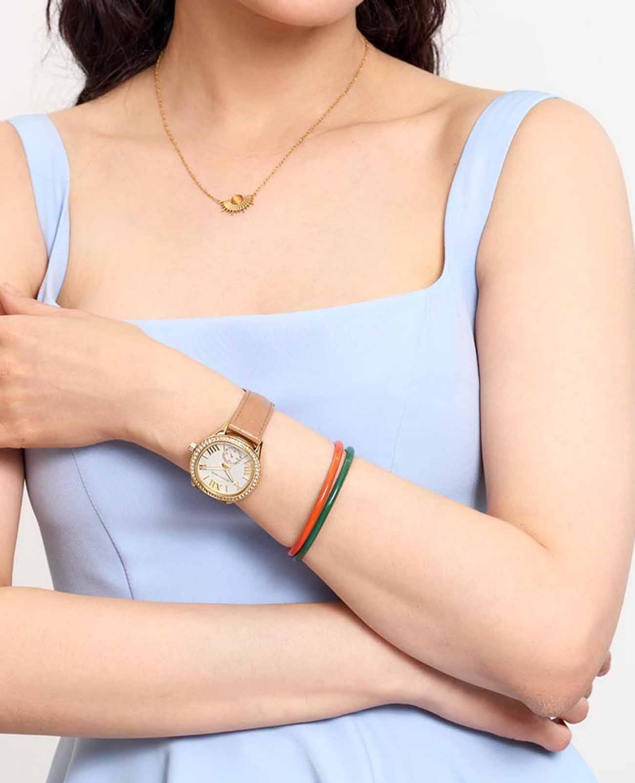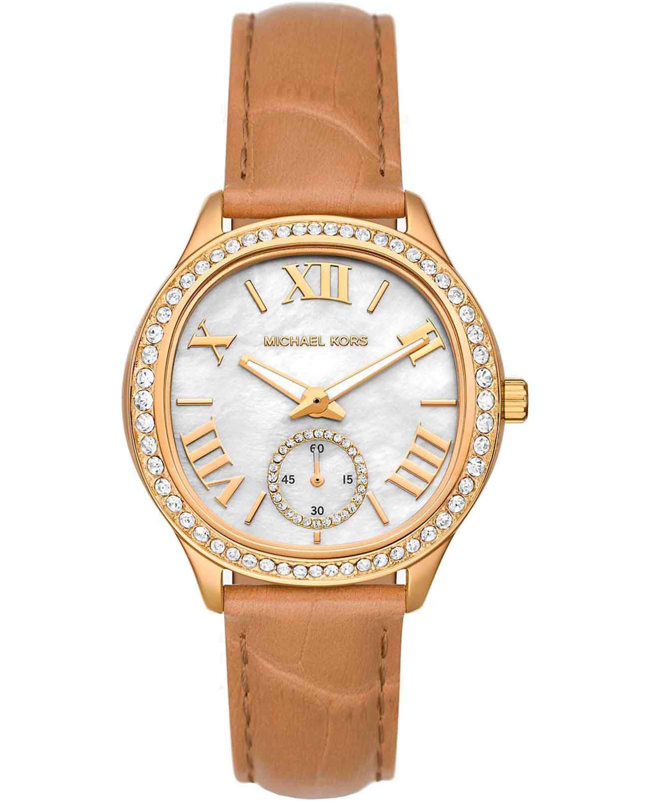 Эти часы — идеальный аксессуар, который придаст женскому образу завершенность и особый шарм. Женские американские часы Michael Kors Sage MK4819 имеют кварцевый механизм с высокой точностью. Корпус и безельБезельВнешний ободок, закрепляющий стекло. В спортивных часах так называется поворотное кольцо с делениями на циферблате, выполняет роль таймера – замеряет отрезки времени на шкале. Неподвижный безель – элемент декора. Однонаправленно вращающийся безель на дайверских часах позволяет фиксировать моменты погружения и выныривания на поверхность.часов изготовлены из нержавеющей стали с золотистым PVD-покрытиемPVDУльтратонкое покрытие наносится в технике вакуумного напыления, сочетает в себе нитрид титана особой прочности со слоем золота или оксида хрома. Несёт в себе декоративную или защитную функцию.. Перламутровый циферблат и безельБезельВнешний ободок, закрепляющий стекло. В спортивных часах так называется поворотное кольцо с делениями на циферблате, выполняет роль таймера – замеряет отрезки времени на шкале. Неподвижный безель – элемент декора. Однонаправленно вращающийся безель на дайверских часах позволяет фиксировать моменты погружения и выныривания на поверхность. украшены кристаллами. Циферблат с метками в виде римских цифр и штрихов защищен минеральным стекломМинеральное стеклоМинеральное стекло представляет собой искусственно выращенный минерал кварца. Такое стекло отличается особой устойчивостью к повреждениям и царапинам. Уступает по некоторым качествам сапфировому стеклу., что обеспечивает надежную защиту от царапин и повреждений. Секундная стрелка вынесена на отдельный циферблат, обрамленный кристаллами, что придает часам уникальный и стильный вид. Люминесцентное покрытиеЛюминесцентное покрытиеПозволяет считывать показания времени в темноте. Производители наносят на стрелки, часовые индексы, безель или поверхность циферблата светонакопительный состав, дающий холодное свечение. на стрелках обеспечивает отличную видимость в темноте. Класс водозащиты: 50 метров, позволит защитить корпус от случайных брызг или капель дождя. Удобный кожаный коричневый ремешок с тиснением под кожу крокодила с классической застежкой обеспечивает надежную фиксацию на запястье и легкость в надевании и снятии. Эти часы станут отличным дополнением к любому наряду, подчеркивая индивидуальность и стиль их обладательницы.