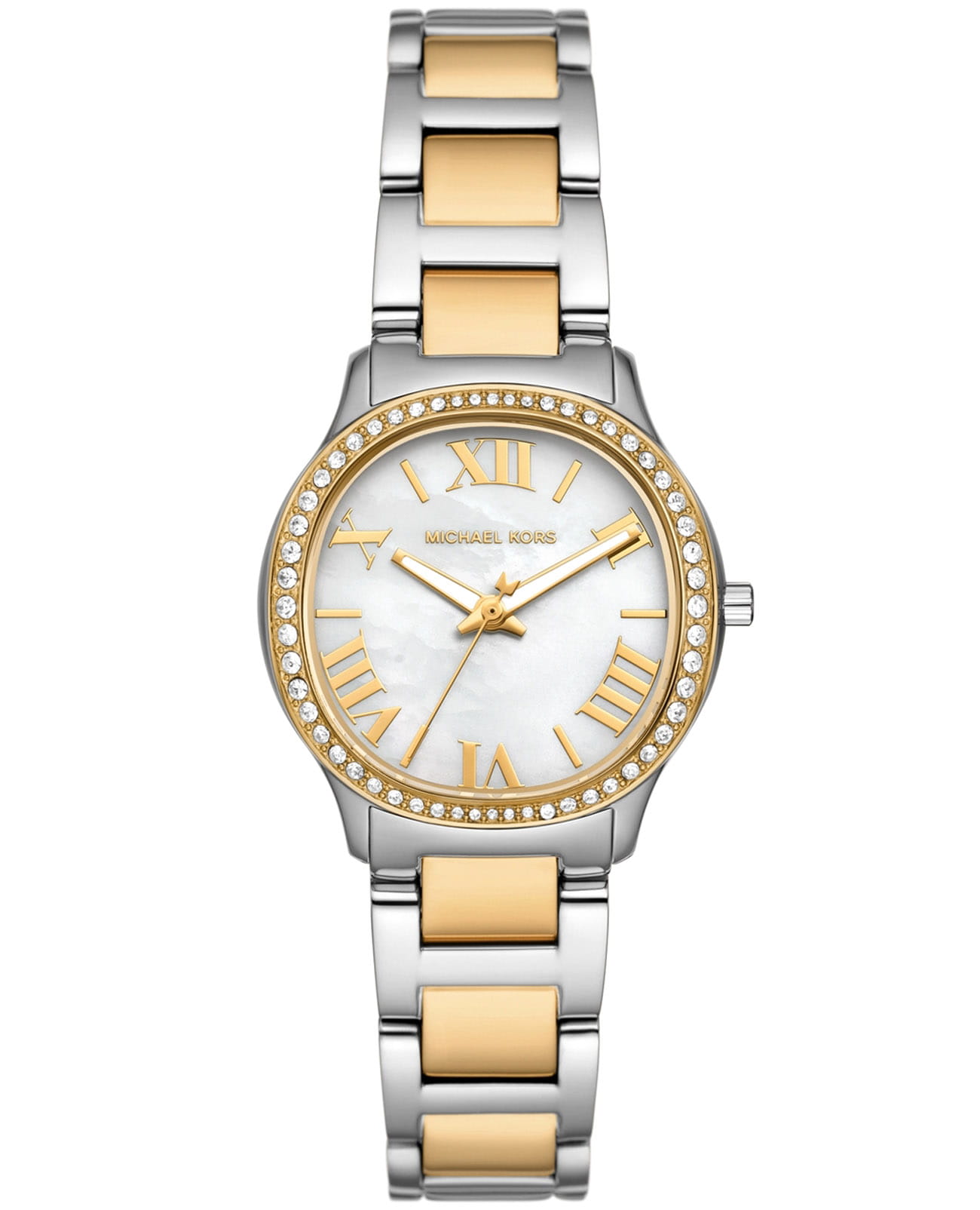 Женские американские часы Michael Kors SAGE MK4910 имеют кварцевый механизм с высокой точностью. Корпус часов изготовлен из нержавеющей стали серебристого цвета, диаметром 31 мм. Циферблат с метками в виде римских цифр защищен минеральным стекломМинеральное стеклоМинеральное стекло представляет собой искусственно выращенный минерал кварца. Такое стекло отличается особой устойчивостью к повреждениям и царапинам. Уступает по некоторым качествам сапфировому стеклу., что обеспечивает надежную защиту от царапин и повреждений. Неподвижный безельБезельВнешний ободок, закрепляющий стекло. В спортивных часах так называется поворотное кольцо с делениями на циферблате, выполняет роль таймера – замеряет отрезки времени на шкале. Неподвижный безель – элемент декора. Однонаправленно вращающийся безель на дайверских часах позволяет фиксировать моменты погружения и выныривания на поверхность. с PVD-покрытиемPVDУльтратонкое покрытие наносится в технике вакуумного напыления, сочетает в себе нитрид титана особой прочности со слоем золота или оксида хрома. Несёт в себе декоративную или защитную функцию. украшен кристаллами. Класс водозащиты: 50 метров позволит защитить корпус от случайных брызг или капель дождя. Стрелки с люминесцентным покрытиемЛюминесцентное покрытиеПозволяет считывать показания времени в темноте. Производители наносят на стрелки, часовые индексы, безель или поверхность циферблата светонакопительный состав, дающий холодное свечение.. Стальной браслет с частичным PVD-покрытиемPVDУльтратонкое покрытие наносится в технике вакуумного напыления, сочетает в себе нитрид титана особой прочности со слоем золота или оксида хрома. Несёт в себе декоративную или защитную функцию. на раскладной застёжкеРаскладная застёжкаТакой тип застёжки используется только на браслетах из металла. Она никогда не раскрывается полностью, происходит разделение на 2 и более частей. Раскладывающая застёжка снизит вероятность потери часов к минимуму. обеспечивает надежную фиксацию на запястье и легкость в надевании и снятии. Эти часы станут отличным дополнением к любому наряду, подчеркивая индивидуальность и стиль их обладательницы. Идеальный аксессуар, который придаст женскому образу завершенность и особый шарм.