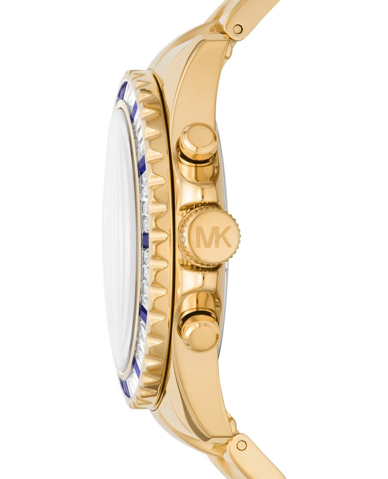 Женские американские часы-хронографХронографФункция позволяет измерять отрезки времени с особой точностью: часы, минуты, секунды. Верным признаком хронографа является наличие на циферблате 3 дополнительных окошек-счётчиков. с секундомеромСекундомерСекундоме́р — прибор, способный измерять интервалы времени с точностью до долей секунды. и с минеральным стекломМинеральное стеклоМинеральное стекло представляет собой искусственно выращенный минерал кварца. Такое стекло отличается особой устойчивостью к повреждениям и царапинам. Уступает по некоторым качествам сапфировому стеклу. Michael Kors Everest MK6971, кварцевый механизм с высокой точностью. Корпус часов изготовлен из стали с PVD-покрытиемPVDУльтратонкое покрытие наносится в технике вакуумного напыления, сочетает в себе нитрид титана особой прочности со слоем золота или оксида хрома. Несёт в себе декоративную или защитную функцию.. БезельБезельВнешний ободок, закрепляющий стекло. В спортивных часах так называется поворотное кольцо с делениями на циферблате, выполняет роль таймера – замеряет отрезки времени на шкале. Неподвижный безель – элемент декора. Однонаправленно вращающийся безель на дайверских часах позволяет фиксировать моменты погружения и выныривания на поверхность. украшен кристаллами. Циферблат выполнен по технологии Sunray (солнечные лучи). Три дополнительных индикатора. Метки в виде штрихов и римских цифр. Окошко даты находится между 4 и 5 часами. Стрелки с люминесцентным покрытиемЛюминесцентное покрытиеПозволяет считывать показания времени в темноте. Производители наносят на стрелки, часовые индексы, безель или поверхность циферблата светонакопительный состав, дающий холодное свечение.. Заводная головка с защитой. Класс водозащиты: 100 метров, позволит плавать, нырять и заниматься другими водными видами спорта. Стальной браслет с PVD-покрытиемPVDУльтратонкое покрытие наносится в технике вакуумного напыления, сочетает в себе нитрид титана особой прочности со слоем золота или оксида хрома. Несёт в себе декоративную или защитную функцию. на раскладной застёжкеРаскладная застёжкаТакой тип застёжки используется только на браслетах из металла. Она никогда не раскрывается полностью, происходит разделение на 2 и более частей. Раскладывающая застёжка снизит вероятность потери часов к минимуму..