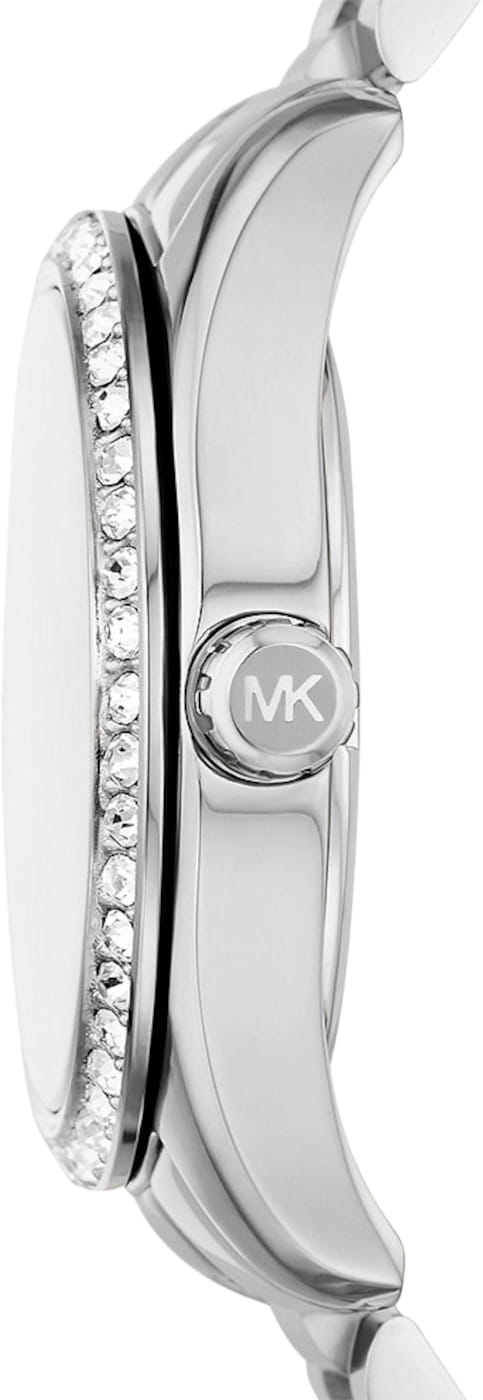 Женские американские часы с минеральным стекломМинеральное стеклоМинеральное стекло представляет собой искусственно выращенный минерал кварца. Такое стекло отличается особой устойчивостью к повреждениям и царапинам. Уступает по некоторым качествам сапфировому стеклу. Michael Kors Lexington MK7445, кварцевый механизм с высокой точностью. Корпус часов изготовлен из нержавеющей стали. БезельБезельВнешний ободок, закрепляющий стекло. В спортивных часах так называется поворотное кольцо с делениями на циферблате, выполняет роль таймера – замеряет отрезки времени на шкале. Неподвижный безель – элемент декора. Однонаправленно вращающийся безель на дайверских часах позволяет фиксировать моменты погружения и выныривания на поверхность. и циферблат украшены кристаллами. Класс водозащиты: 100 метров, позволит плавать, нырять и заниматься другими водными видами спорта. Стальной браслет из нержавеющей стали на раскладной застёжкеРаскладная застёжкаТакой тип застёжки используется только на браслетах из металла. Она никогда не раскрывается полностью, происходит разделение на 2 и более частей. Раскладывающая застёжка снизит вероятность потери часов к минимуму..