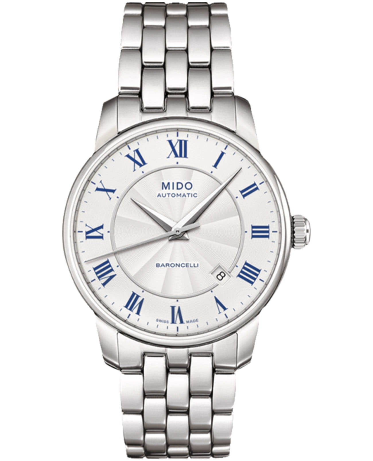 Швейцарские мужские наручные часы Mido Baroncelli M8600.4.21.1, механический механизм (автоматический калибр) с высокой точностью. Сапфировое стеклоСапфировое стеклоПрочный и надёжный материал из кристалла сапфира синтетического происхождения, характеризующийся особой твёрдостью и устойчивостью к царапинам и повреждениям. устойчивое к появлению царапин, обладающее высокой прозрачностью. Отображение даты между 4 и 5 часами. Класс водозащиты: 50 метров, позволит защитить корпус от случайных брызг или капель дождя. Корпус часов изготовлен из стали. Стальной браслет на раскладной застёжкеРаскладная застёжкаТакой тип застёжки используется только на браслетах из металла. Она никогда не раскрывается полностью, происходит разделение на 2 и более частей. Раскладывающая застёжка снизит вероятность потери часов к минимуму..