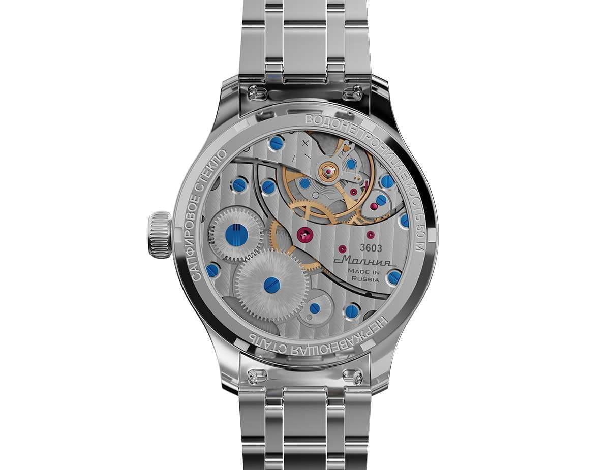 Мужские механические часы с ручным подзаводом — это аксессуар от легендарного бренда «МОЛНИЯ», созданный на Челябинском часовом заводе. Корпус диаметром 41 мм выполнен из нержавеющей стали 316L с зеркальной полировкой. БезельБезельВнешний ободок, закрепляющий стекло. В спортивных часах так называется поворотное кольцо с делениями на циферблате, выполняет роль таймера – замеряет отрезки времени на шкале. Неподвижный безель – элемент декора. Однонаправленно вращающийся безель на дайверских часах позволяет фиксировать моменты погружения и выныривания на поверхность. также выполнен из стали с зеркальной отделкой. Циферблат белого цвета оформлен индексами и стрелками. Малая секундная стрелка вынесена на позицию 9 часов. Циферблат защищён сапфировым стекломСапфировое стеклоПрочный и надёжный материал из кристалла сапфира синтетического происхождения, характеризующийся особой твёрдостью и устойчивостью к царапинам и повреждениям. толщиной 2 мм. Механизм — мануфактурный калибр 3603, собранный вручную, с запасом хода до 40 часов. Прозрачная задняя крышка позволяет наблюдать за работой механизма. Часы оснащены стальным браслетом с раскладной застёжкойРаскладная застёжкаТакой тип застёжки используется только на браслетах из металла. Она никогда не раскрывается полностью, происходит разделение на 2 и более частей. Раскладывающая застёжка снизит вероятность потери часов к минимуму. с кнопочным открытием и системой быстрой замены. Водонепроницаемость 50 м позволяет использовать часы в повседневных условиях. Идеальный выбор для тех, кто ценит российское качество и традиции.