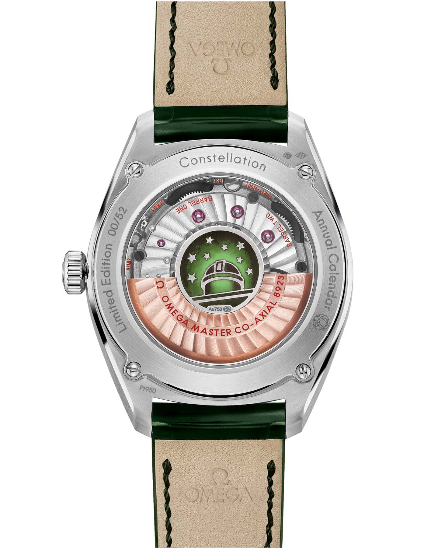 Циферблат "Pie Pan" из платины 950 пробы напоминает первую модель Constellation 1952 года. Каждая грань содержит название месяца в соответствии с функцией . На циферблате размещены звезда Constellation и логотип OMEGA из 18-каратного белого золота18-каратное золотоОбозначение по каратной системе пробирования, оно показывает, сколько драгоценного металла содержится в изделии. 18 карат - в составе 75% чистого золота, соответствует 750 пробе.