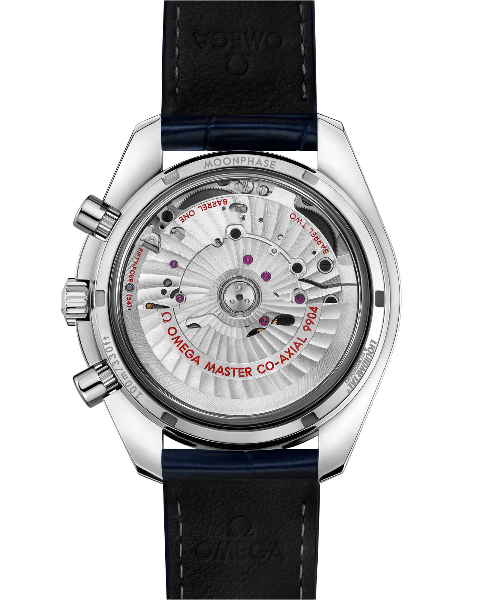 Speedmaster Moonphase воплощает космическое наследие OMEGA, представив уникальную модель с двумя невероятно детализированными изображениями Луны. 44,25-мм корпус из нержавеющей стали с синим керамическим безелемБезельВнешний ободок, закрепляющий стекло. В спортивных часах так называется поворотное кольцо с делениями на циферблате, выполняет роль таймера – замеряет отрезки времени на шкале. Неподвижный безель – элемент декора. Однонаправленно вращающийся безель на дайверских часах позволяет фиксировать моменты погружения и выныривания на поверхность., украшенным тахиметрической шкалойТахиметрРазмеченная шкала, располагается на ободке или безеле часов. Тахиметр позволяет рассчитать скорость на определённом участке пути, расстояние измеряется в километрах или милях. из Liquidmetal™, сочетается с синим кожаным ремешком и полированной застежкой. Синий циферблат с радиальным сатинированием и индексами с родиевым покрытием дополнен уникальным указателем фаз Луны на "6 часах", где лунный диск из металлизированного хрусталя с микроструктурой поражает реалистичностью. Прецизионный механизм OMEGA Co-Axial Master Chronometer 9904 с сертификатом METAS продолжает традиции космической точности.