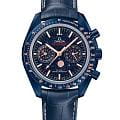Speedmaster Blue Side of the Moon — дань уважения шести легендарным лунным миссиям, вдохновленная таинственным синим сиянием космоса. 44,25-мм корпус из высокотехнологичной керамики глубокого синего цвета с керамическим безелемБезельВнешний ободок, закрепляющий стекло. В спортивных часах так называется поворотное кольцо с делениями на циферблате, выполняет роль таймера – замеряет отрезки времени на шкале. Неподвижный безель – элемент декора. Однонаправленно вращающийся безель на дайверских часах позволяет фиксировать моменты погружения и выныривания на поверхность., украшенным тахиметрической шкалойТахиметрРазмеченная шкала, располагается на ободке или безеле часов. Тахиметр позволяет рассчитать скорость на определённом участке пути, расстояние измеряется в километрах или милях. из OMEGA Ceragold™, сочетается с синим кожаным ремешком и раскладывающейся застежкой из титана с керамической отделкой. Циферблат из мерцающего авантюринового стекла демонстрирует индексы и стрелки из золота Sedna™18-каратное золотоОбозначение по каратной системе пробирования, оно показывает, сколько драгоценного металла содержится в изделии. 18 карат - в составе 75% чистого золота, соответствует 750 пробе.