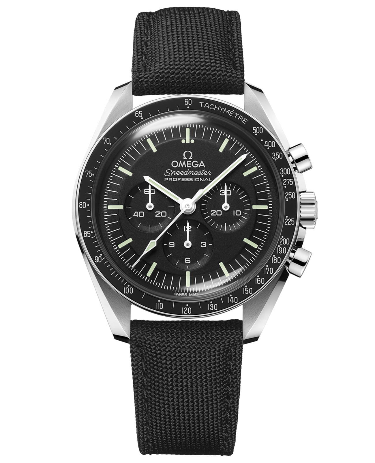 Speedmaster Moonwatch — легендарная модель, вошедшая в историю как первые часы на Луне. Шесть космических миссий сделали их символом инженерного мастерства OMEGA. Эти хронометры представлены в 42-миллиметровом корпусе из нержавеющей стали с нейлоновым ремешком, дополнены хезалитовым стеклом на циферблате и фирменным медальоном с морским коньком на задней крышке. Их асимметричный дизайн повторяет черты легендарного Speedmaster 4-го поколения, с черным многоуровневым циферблатом и характерной точкой у отметки 90 на безелеБезельВнешний ободок, закрепляющий стекло. В спортивных часах так называется поворотное кольцо с делениями на циферблате, выполняет роль таймера – замеряет отрезки времени на шкале. Неподвижный безель – элемент декора. Однонаправленно вращающийся безель на дайверских часах позволяет фиксировать моменты погружения и выныривания на поверхность. из анодированного алюминия. В основе работы — высокоточный механизм OMEGA Co-Axial Master Chronometer 3861, управляющий хронографомХронографФункция позволяет измерять отрезки времени с особой точностью: часы, минуты, секунды. Верным признаком хронографа является наличие на циферблате 3 дополнительных окошек-счётчиков. с тремя счетчиками: малыми секундами, 30-минутным и 12-часовым индикаторами.