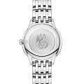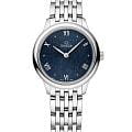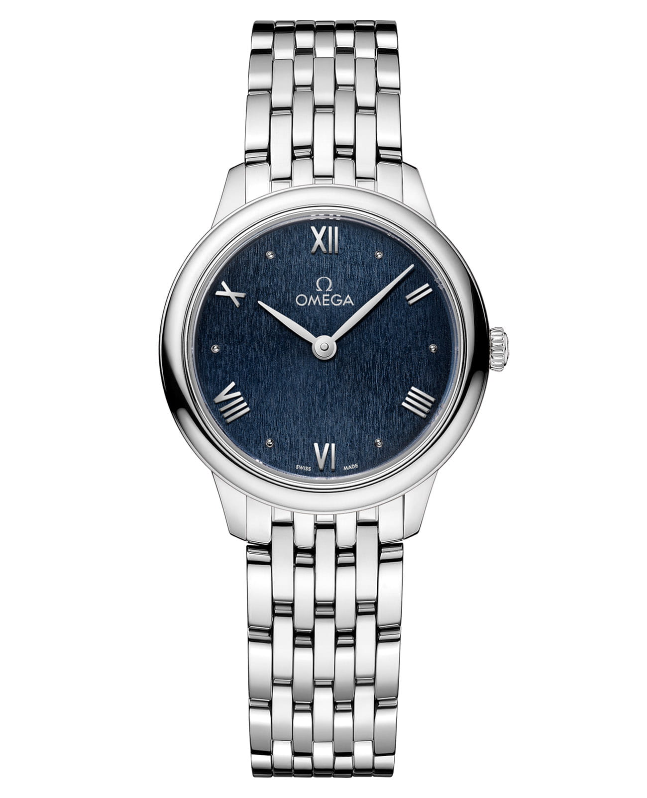 Коллекция OMEGA De Ville Prestige, сохраняющая свою актуальность с 1994 года, предстает в третьем поколении. Эти часы продолжают быть символом классического дизайна и утонченной элегантности. Модели, которые привлекают внимание разнообразием узоров, отделок и цветов, идеально подходят для людей с различными стилями жизни и характерами. Часы в корпусе диаметром 27,5 мм из нержавеющей стали имеют циферблат с PVD-покрытиемPVDУльтратонкое покрытие наносится в технике вакуумного напыления, сочетает в себе нитрид титана особой прочности со слоем золота или оксида хрома. Несёт в себе декоративную или защитную функцию. синего цвета, украшенный рельефным произвольным вертикальным узором и радиальным сатинированием. На циферблате расположены стрелки с родиевым покрытием, а также чередующиеся римские цифры и индексы в форме кабошона. Изделие с лаконичным дизайном дополнено задней крышкой, украшенной рельефным медальоном с изображением бога времени Хроноса. Часы представлены с браслетом из нержавеющей стали. Модель оснащена кварцевым механизмом OMEGA 4061, который обеспечивает срок службы элемента питания не менее 48 месяцев.