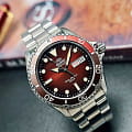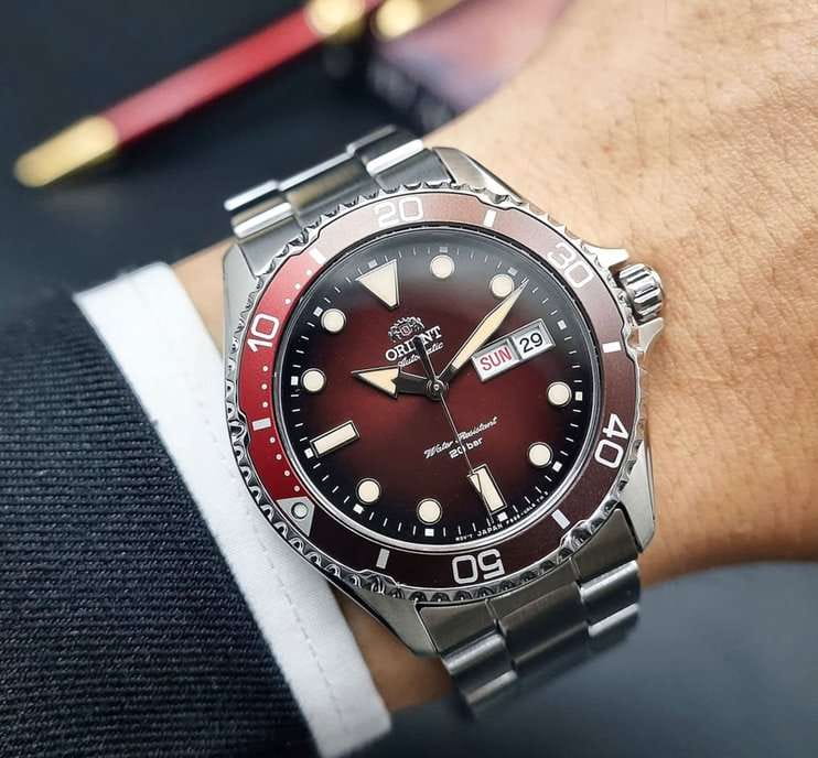 Orient Kamasu RA-AA0814R — стильные и надёжные часы, созданные для активного образа жизни и водных приключений. Корпус диаметром 41,8 мм выполнен из нержавеющей стали, что обеспечивает прочность и долговечность. Однонаправленный вращающийся безельБезельВнешний ободок, закрепляющий стекло. В спортивных часах так называется поворотное кольцо с делениями на циферблате, выполняет роль таймера – замеряет отрезки времени на шкале. Неподвижный безель – элемент декора. Однонаправленно вращающийся безель на дайверских часах позволяет фиксировать моменты погружения и выныривания на поверхность. с 60-минутной шкалой позволяет точно отслеживать время погружения. Красный циферблат с эффектом солнечных лучей украшен накладными часовыми индексами и стрелками с люминесцентным покрытиемЛюминесцентное покрытиеПозволяет считывать показания времени в темноте. Производители наносят на стрелки, часовые индексы, безель или поверхность циферблата светонакопительный состав, дающий холодное свечение., что гарантирует отличную читаемость в любых условиях. Окошки даты и дня недели расположены на отметке «3 часа» для удобства. Защиту циферблата обеспечивает сапфировое стеклоСапфировое стеклоПрочный и надёжный материал из кристалла сапфира синтетического происхождения, характеризующийся особой твёрдостью и устойчивостью к царапинам и повреждениям., устойчивое к царапинам. Внутри установлен автоматический механизм Orient калибра F6922 с 22 камнями, обеспечивающий точность хода и запас энергии до 40 часов. Механизм поддерживает автоподзавод, ручной завод и стоп-секунду. Часы укомплектованы браслетом из нержавеющей стали, а раскладная застёжкаРаскладная застёжкаТакой тип застёжки используется только на браслетах из металла. Она никогда не раскрывается полностью, происходит разделение на 2 и более частей. Раскладывающая застёжка снизит вероятность потери часов к минимуму. гарантирует надёжную фиксацию на запястье. Водонепроницаемость 200 метров делает модель отличным выбором для дайвинга и активного отдыха.