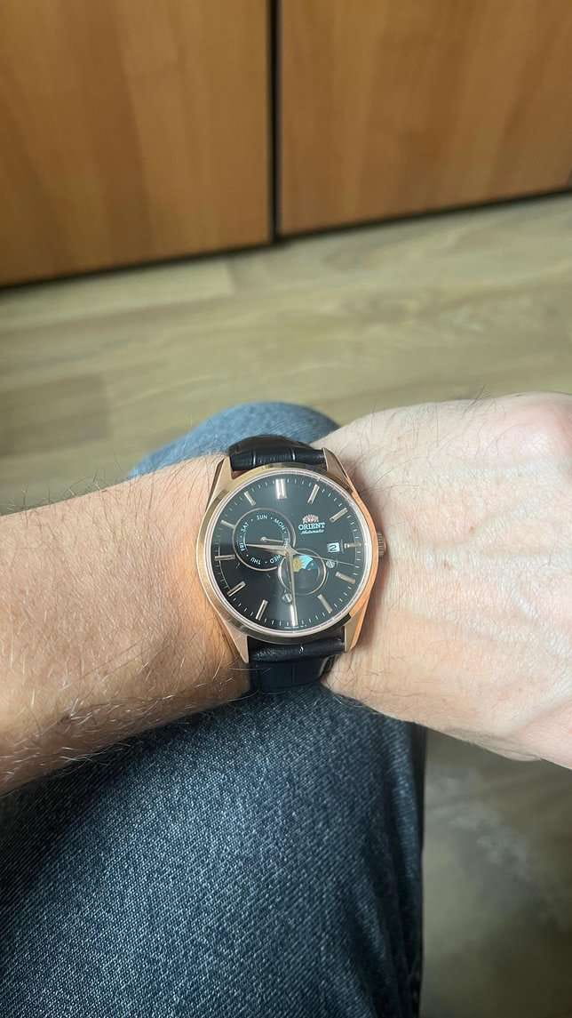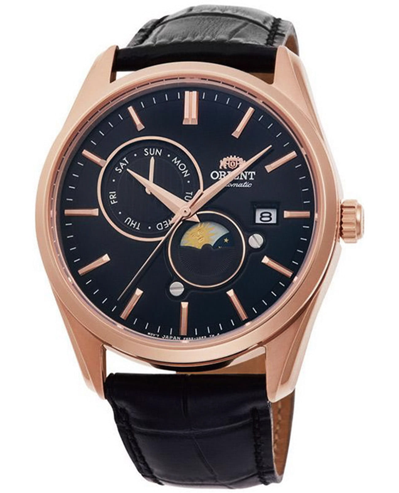 Часы Orient RA-AK0309B10B из коллекции Sun & Moon — это элегантная модель, объединяющая классический стиль и функциональные особенности. Корпус диаметром 41,5 мм выполнен из нержавеющей стали с изысканным PVD-покрытиемPVDУльтратонкое покрытие наносится в технике вакуумного напыления, сочетает в себе нитрид титана особой прочности со слоем золота или оксида хрома. Несёт в себе декоративную или защитную функцию. розового золота, а сапфировое стеклоСапфировое стеклоПрочный и надёжный материал из кристалла сапфира синтетического происхождения, характеризующийся особой твёрдостью и устойчивостью к царапинам и повреждениям. обеспечивает надёжную защиту циферблата от царапин.