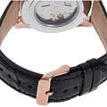Чёрный кожаный ремешок с текстурой под крокодила и стандартная застежка завершает элегантный образ, обеспечивая комфортное ношение. Водонепроницаемость до 50 метров делает модель подходящей для повседневного использования.