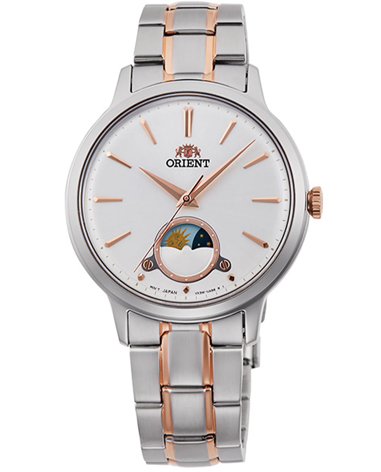 Женские кварцевые наручные часы Orient RA-KB0001S (RA-KB0001S10B) коллекции Sun & Moon Classic. Калибр механизма — VX3WE. Максимально допустимая погрешность точности хода +20/-20 секунд в месяц. На данной модели отображается время суток (день/ночь). Стальной браслет. На корпус и браслет частично нанесено стойкое PVD покрытие. Водонепроницаемость WR (3 атм).