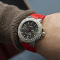Многокомпонентный корпус из нержавеющей стали, керамический безельБезельВнешний ободок, закрепляющий стекло. В спортивных часах так называется поворотное кольцо с делениями на циферблате, выполняет роль таймера – замеряет отрезки времени на шкале. Неподвижный безель – элемент декора. Однонаправленно вращающийся безель на дайверских часах позволяет фиксировать моменты погружения и выныривания на поверхность. с минутной шкалой. Сапфировое стеклоСапфировое стеклоПрочный и надёжный материал из кристалла сапфира синтетического происхождения, характеризующийся особой твёрдостью и устойчивостью к царапинам и повреждениям., выпуклое с обеих сторон, внутреннее антибликовое покрытие. Стрелки и метки с люминесцентным покрытиемЛюминесцентное покрытиеПозволяет считывать показания времени в темноте. Производители наносят на стрелки, часовые индексы, безель или поверхность циферблата светонакопительный состав, дающий холодное свечение.. Завинчивающаяся прозрачная задняя крышка из минерального стеклаМинеральное стеклоМинеральное стекло представляет собой искусственно выращенный минерал кварца. Такое стекло отличается особой устойчивостью к повреждениям и царапинам. Уступает по некоторым качествам сапфировому стеклу.. Каучуковый ремень.