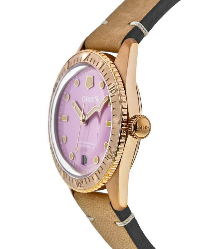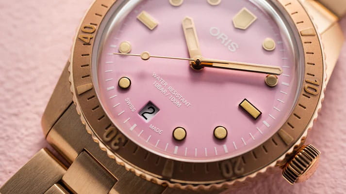 Часы Divers Sixty-Five "Cotton Candy" - это маяк радости. Корпус, безель, заводная головка полностью выполнены из бронзы, а циферблат окрашен в яркие цвета. Часы в 38-миллиметровом корпусе унисекс оснащены механизмом Swiss Made. Эти часы символизируют оптимизм и лучшие времена.