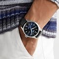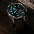 Многокомпонентный корпус из нержавеющей стали. Сапфировое стеклоСапфировое стеклоПрочный и надёжный материал из кристалла сапфира синтетического происхождения, характеризующийся особой твёрдостью и устойчивостью к царапинам и повреждениям., выпуклое с обеих сторон, внутреннее антибликовое покрытие. Нержавеющая сталь, завинчивающаяся прозрачная задняя крышка из минерального стеклаМинеральное стеклоМинеральное стекло представляет собой искусственно выращенный минерал кварца. Такое стекло отличается особой устойчивостью к повреждениям и царапинам. Уступает по некоторым качествам сапфировому стеклу.. Стрелки с люминесцентным покрытиемЛюминесцентное покрытиеПозволяет считывать показания времени в темноте. Производители наносят на стрелки, часовые индексы, безель или поверхность циферблата светонакопительный состав, дающий холодное свечение.. Кожаный ремень.