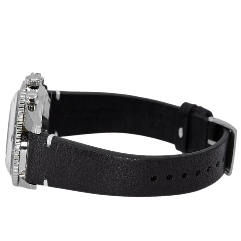 Многокомпонентный корпус из нержавеющей стали, вращающийся безельБезельВнешний ободок, закрепляющий стекло. В спортивных часах так называется поворотное кольцо с делениями на циферблате, выполняет роль таймера – замеряет отрезки времени на шкале. Неподвижный безель – элемент декора. Однонаправленно вращающийся безель на дайверских часах позволяет фиксировать моменты погружения и выныривания на поверхность. с минутной шкалой. Сапфировое стеклоСапфировое стеклоПрочный и надёжный материал из кристалла сапфира синтетического происхождения, характеризующийся особой твёрдостью и устойчивостью к царапинам и повреждениям., выпуклое с обеих сторон, внутреннее антибликовое покрытие. Прозрачная задняя крышка из сапфирового стеклаСапфировое стеклоПрочный и надёжный материал из кристалла сапфира синтетического происхождения, характеризующийся особой твёрдостью и устойчивостью к царапинам и повреждениям.. Стрелки и метки с люминесцентным покрытиемЛюминесцентное покрытиеПозволяет считывать показания времени в темноте. Производители наносят на стрелки, часовые индексы, безель или поверхность циферблата светонакопительный состав, дающий холодное свечение.. Завинчивающаяся заводная головка. Кожаный ремень.