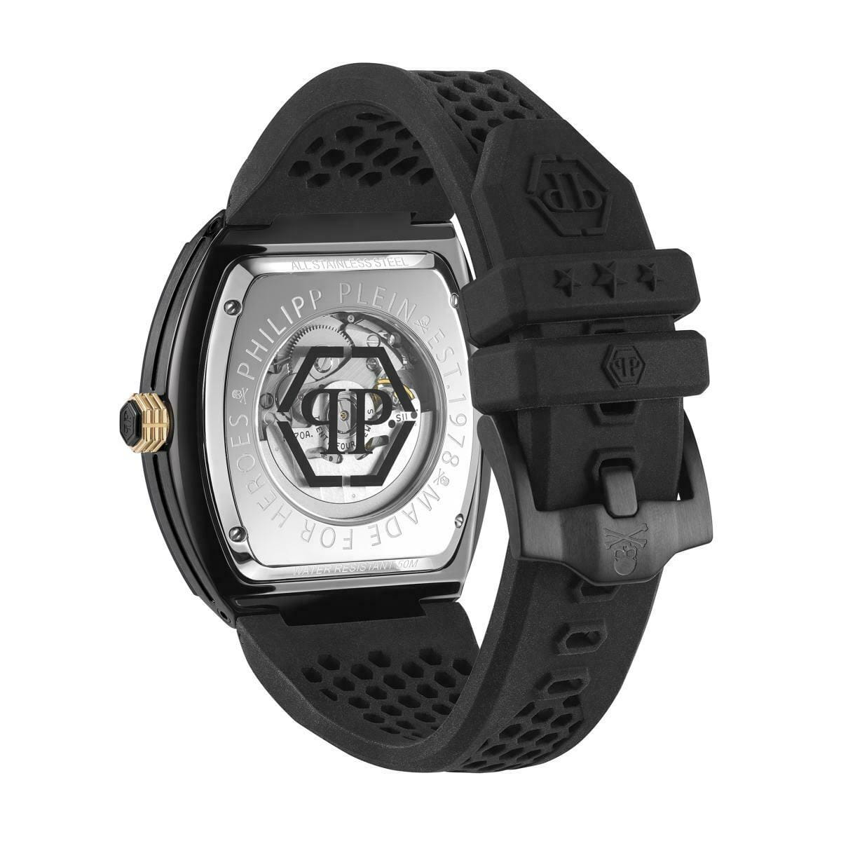 Яркие мужские часы Philipp Plein The Skeleton PWBAA0521, механический механизм (автоматический калибр) с высокой точностью. Класс водозащиты: 50 метров, позволит защитить корпус от случайных брызг или капель дождя. Корпус часов изготовлен из стали, цвета.
