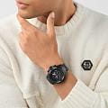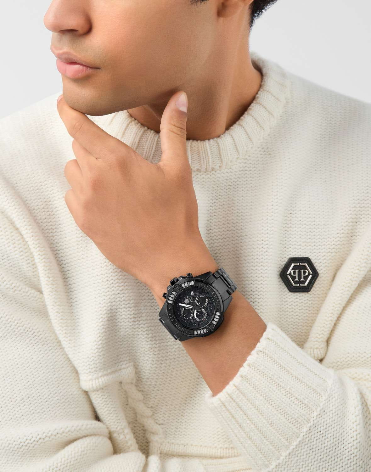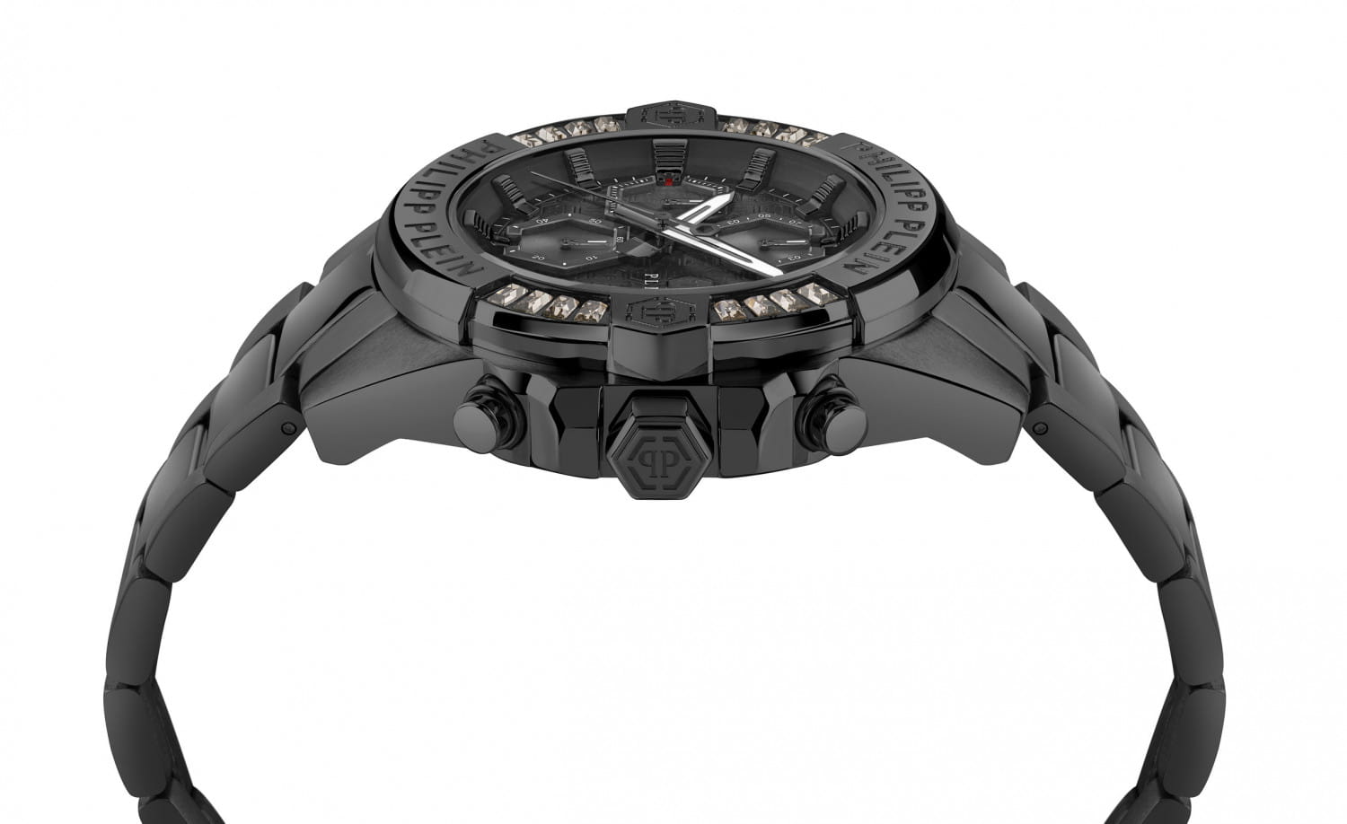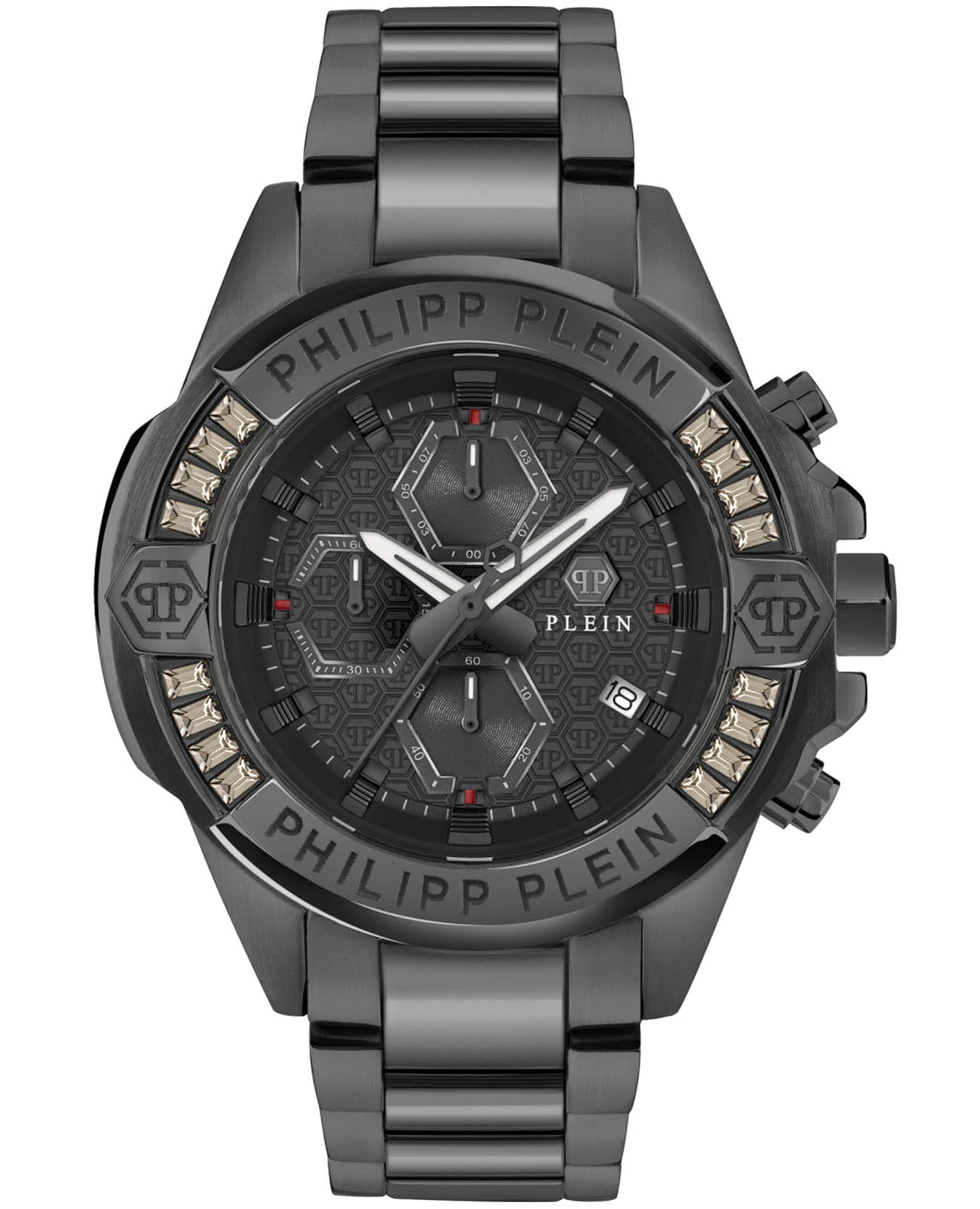 Philipp Plein The $kull Chrono PWWFA0725 - яркие часы-хронографХронографФункция позволяет измерять отрезки времени с особой точностью: часы, минуты, секунды. Верным признаком хронографа является наличие на циферблате 3 дополнительных окошек-счётчиков. в революционном дизайне несомненно добавят вам выразительности и станут главным акцентом вашего стильного образа. Мужские кварцевые часы с высокой точностью. Круглый стальной корпус с PVD-покрытиемPVDУльтратонкое покрытие наносится в технике вакуумного напыления, сочетает в себе нитрид титана особой прочности со слоем золота или оксида хрома. Несёт в себе декоративную или защитную функцию. черного цвета, диаметром 44 мм. Метки в виде штрихов. Минеральное стеклоМинеральное стеклоМинеральное стекло представляет собой искусственно выращенный минерал кварца. Такое стекло отличается особой устойчивостью к повреждениям и царапинам. Уступает по некоторым качествам сапфировому стеклу. защищает циферблат от царапин. Люминесцентное покрытиеЛюминесцентное покрытиеПозволяет считывать показания времени в темноте. Производители наносят на стрелки, часовые индексы, безель или поверхность циферблата светонакопительный состав, дающий холодное свечение. стрелок и меток позволит следить за временем даже в полной темноте. Окошко даты находится в положении 4 часа. Стальной браслет с PVD-покрытиемPVDУльтратонкое покрытие наносится в технике вакуумного напыления, сочетает в себе нитрид титана особой прочности со слоем золота или оксида хрома. Несёт в себе декоративную или защитную функцию. на застёжке-бабочке с кнопкамиЗастёжка "бабочка"Такой вид застёжки дополняется предохранителями, помогающими избежать случайного раскрытия браслета. Обладают изящным исполнением. , обеспечивает комфортное ношение. БезельБезельВнешний ободок, закрепляющий стекло. В спортивных часах так называется поворотное кольцо с делениями на циферблате, выполняет роль таймера – замеряет отрезки времени на шкале. Неподвижный безель – элемент декора. Однонаправленно вращающийся безель на дайверских часах позволяет фиксировать моменты погружения и выныривания на поверхность. инкрустирован кристаллами. Граненая заводная головка. Влагозащита: 50 метров, позволит защитить корпус от случайных брызг или капель дождя. Идеальный аксессуар для тех, кто ценит индивидуальность и не боится выделяться из толпы.