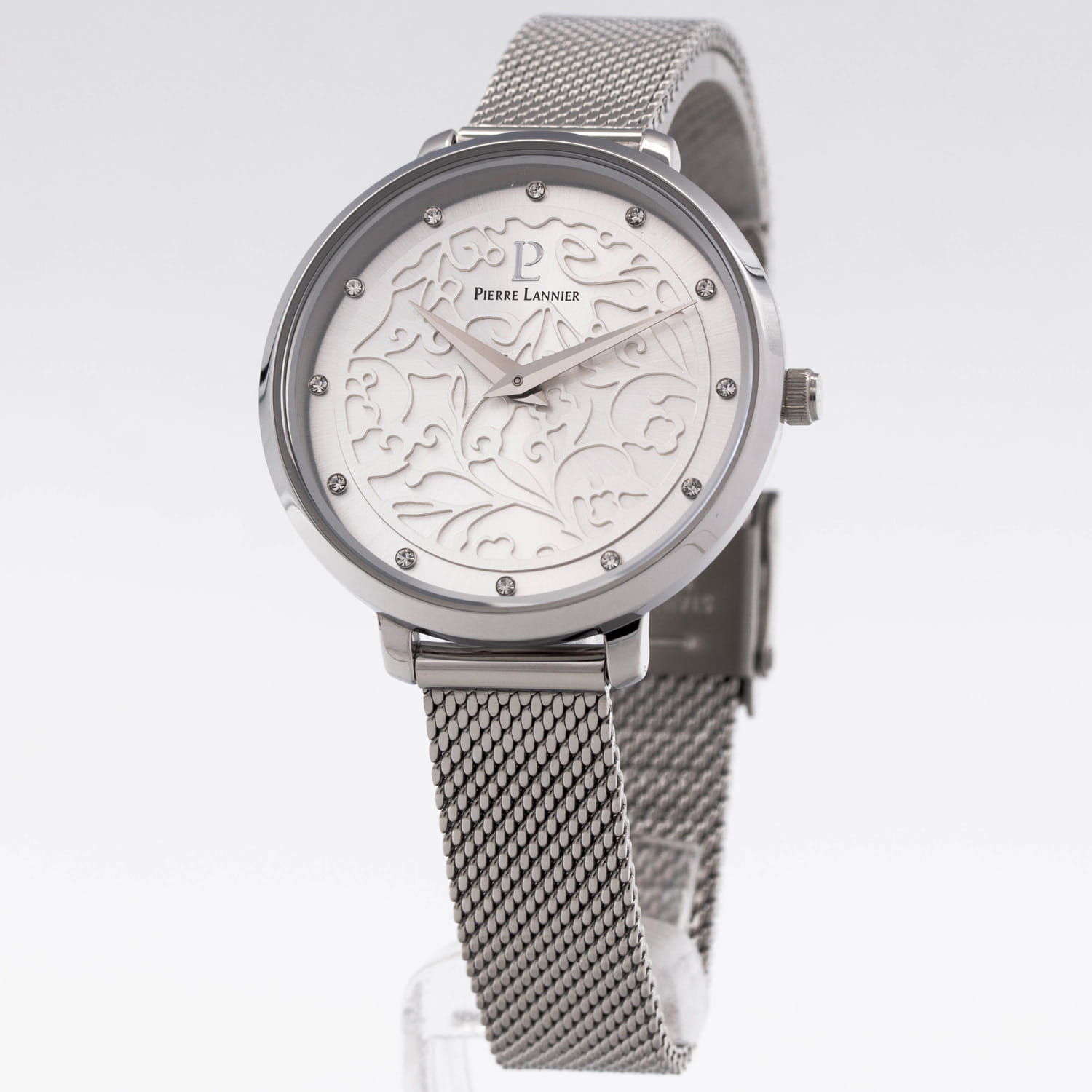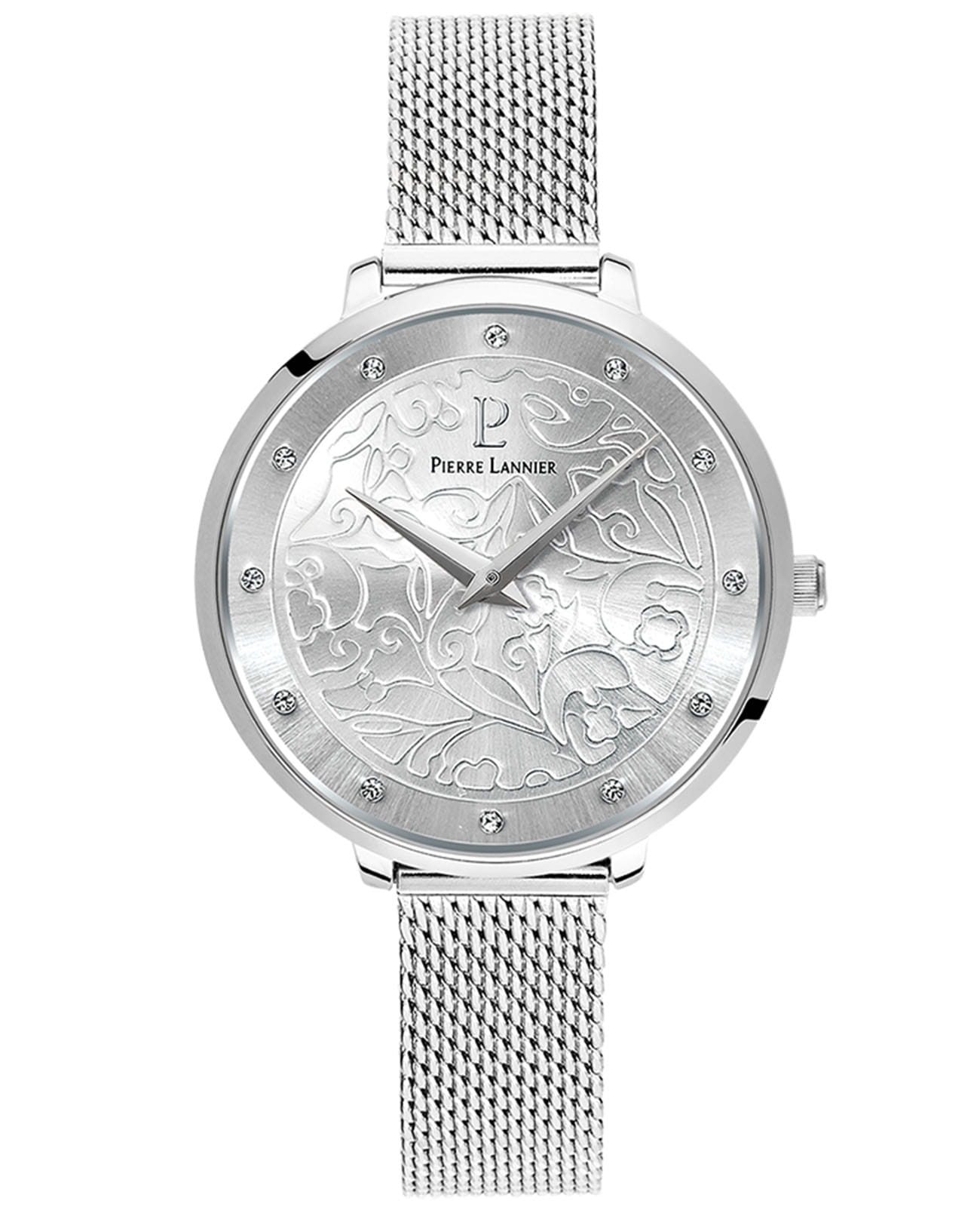 Женские кварцевые часы Pierre Lannier Eolia 040J628. Минеральное стеклоМинеральное стеклоМинеральное стекло представляет собой искусственно выращенный минерал кварца. Такое стекло отличается особой устойчивостью к повреждениям и царапинам. Уступает по некоторым качествам сапфировому стеклу. устойчивое к мелким механическим повреждениям. Центральные часовая и минутная стрелки. Корпус выполнен из нержавеющей стали. Водостойкость: 50 метров, позволит защитить корпус от случайных брызг или капель дождя. Стальной браслет миланского плетения с раскладной застёжкойРаскладная застёжкаТакой тип застёжки используется только на браслетах из металла. Она никогда не раскрывается полностью, происходит разделение на 2 и более частей. Раскладывающая застёжка снизит вероятность потери часов к минимуму.. Серебристый циферблат украшен кристаллами.