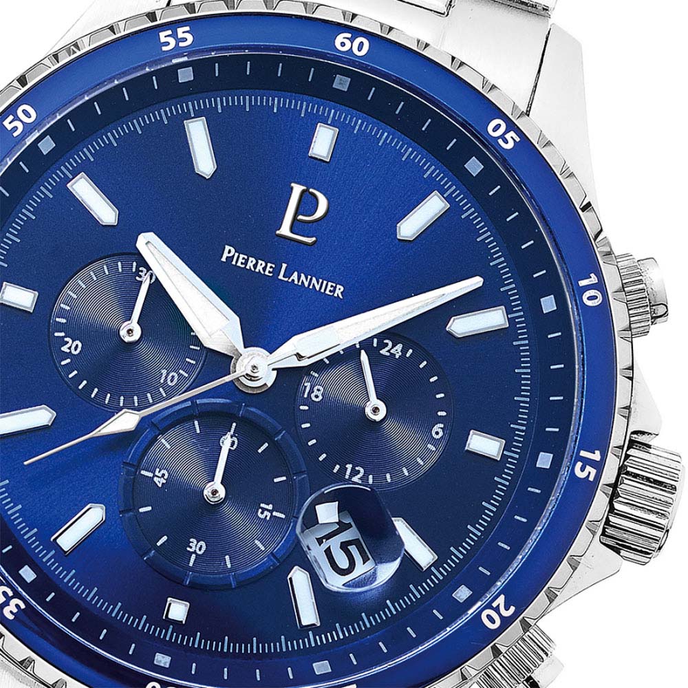 Мужские кварцевые часы Pierre Lannier Cronos 226G161. Часы хронографХронографФункция позволяет измерять отрезки времени с особой точностью: часы, минуты, секунды. Верным признаком хронографа является наличие на циферблате 3 дополнительных окошек-счётчиков. с секундомеромСекундомерСекундоме́р — прибор, способный измерять интервалы времени с точностью до долей секунды.. Минеральное стеклоМинеральное стеклоМинеральное стекло представляет собой искусственно выращенный минерал кварца. Такое стекло отличается особой устойчивостью к повреждениям и царапинам. Уступает по некоторым качествам сапфировому стеклу. устойчивое к мелким механическим повреждениям. Центральные часовая и минутная стрелки, секундная стрелка вынесена на малый циферблат. Окошко даты между 4 и 5 часам. Корпус и вращающийся безельБезельВнешний ободок, закрепляющий стекло. В спортивных часах так называется поворотное кольцо с делениями на циферблате, выполняет роль таймера – замеряет отрезки времени на шкале. Неподвижный безель – элемент декора. Однонаправленно вращающийся безель на дайверских часах позволяет фиксировать моменты погружения и выныривания на поверхность. из нержавеющей стали с IP-покрытиемIP-покрытиеМетод ионного напыления. Демонстрирует повышенную устойчивость к истиранию, окислению и химическим веществам. Под воздействием высокого давления и температуры около 1500°C молекулы металла надёжно соединяются с частицами корпуса часов.. Стрелки с люминесцентным покрытиемЛюминесцентное покрытиеПозволяет считывать показания времени в темноте. Производители наносят на стрелки, часовые индексы, безель или поверхность циферблата светонакопительный состав, дающий холодное свечение.. Водостойкость: 100 метров, позволит плавать, нырять и заниматься другими водными видами спорта. Стальной браслет с раскладной застёжкойРаскладная застёжкаТакой тип застёжки используется только на браслетах из металла. Она никогда не раскрывается полностью, происходит разделение на 2 и более частей. Раскладывающая застёжка снизит вероятность потери часов к минимуму..