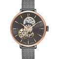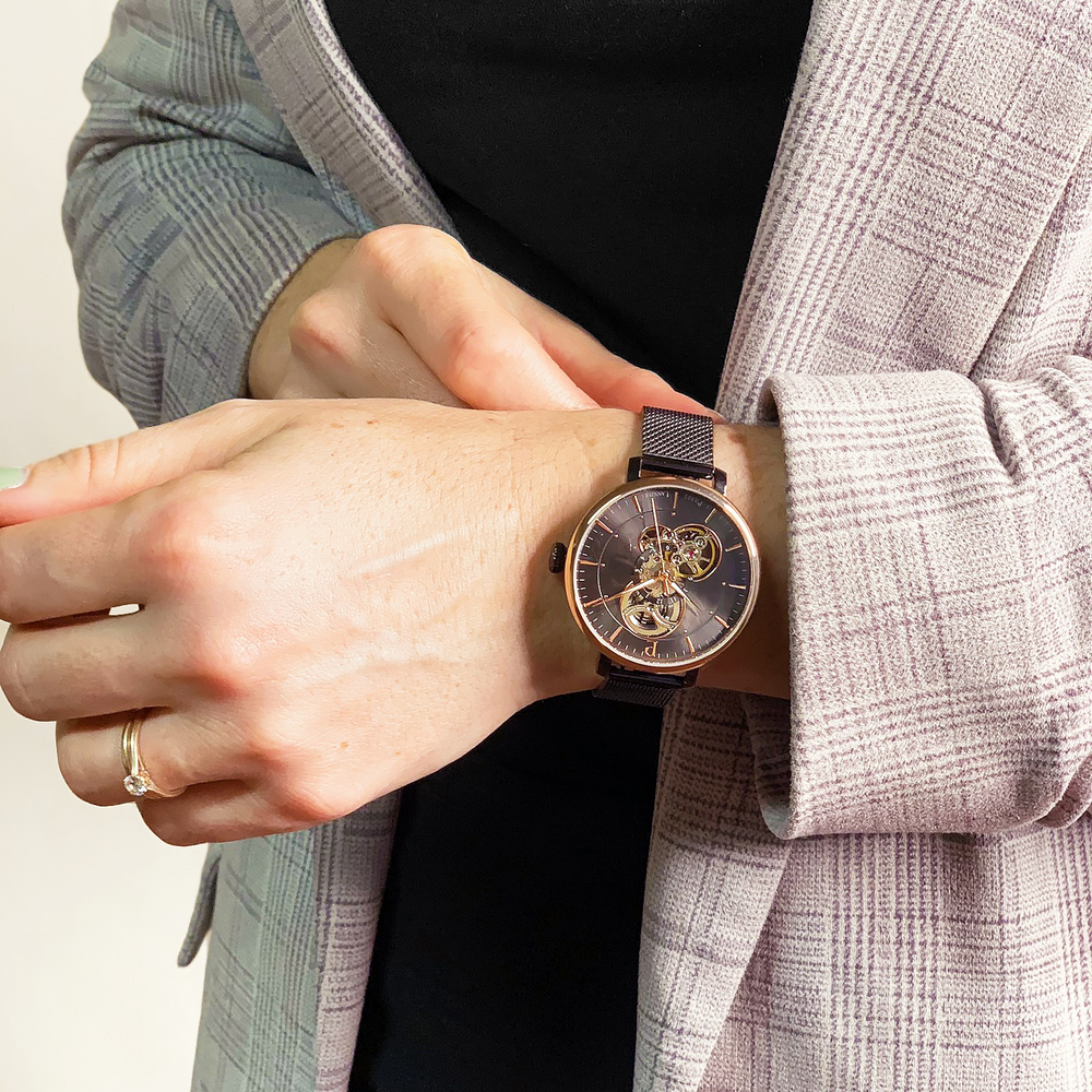 Женские механические часы с автоподзаводом Pierre Lannier Melodie 349A739. Минеральное стеклоМинеральное стеклоМинеральное стекло представляет собой искусственно выращенный минерал кварца. Такое стекло отличается особой устойчивостью к повреждениям и царапинам. Уступает по некоторым качествам сапфировому стеклу. устойчивое к мелким механическим повреждениям. Центральные часовая, минутная и секундная стрелки. Корпус и браслет выполнен из нержавеющей стали с IP-покрытиемIP-покрытиеМетод ионного напыления. Демонстрирует повышенную устойчивость к истиранию, окислению и химическим веществам. Под воздействием высокого давления и температуры около 1500°C молекулы металла надёжно соединяются с частицами корпуса часов.. Стрелки с люминесцентным покрытиемЛюминесцентное покрытиеПозволяет считывать показания времени в темноте. Производители наносят на стрелки, часовые индексы, безель или поверхность циферблата светонакопительный состав, дающий холодное свечение.. Водостойкость: 30 метров, позволит защитить корпус от случайных брызг или капель дождя. Браслет миланского плетения шириной 14 мм с раскладной застёжкойРаскладная застёжкаТакой тип застёжки используется только на браслетах из металла. Она никогда не раскрывается полностью, происходит разделение на 2 и более частей. Раскладывающая застёжка снизит вероятность потери часов к минимуму.. Серый скелетонизированный циферблат. Неподвижный безельБезельВнешний ободок, закрепляющий стекло. В спортивных часах так называется поворотное кольцо с делениями на циферблате, выполняет роль таймера – замеряет отрезки времени на шкале. Неподвижный безель – элемент декора. Однонаправленно вращающийся безель на дайверских часах позволяет фиксировать моменты погружения и выныривания на поверхность. с розовым IP-покрытиемIP-покрытиеМетод ионного напыления. Демонстрирует повышенную устойчивость к истиранию, окислению и химическим веществам. Под воздействием высокого давления и температуры около 1500°C молекулы металла надёжно соединяются с частицами корпуса часов..