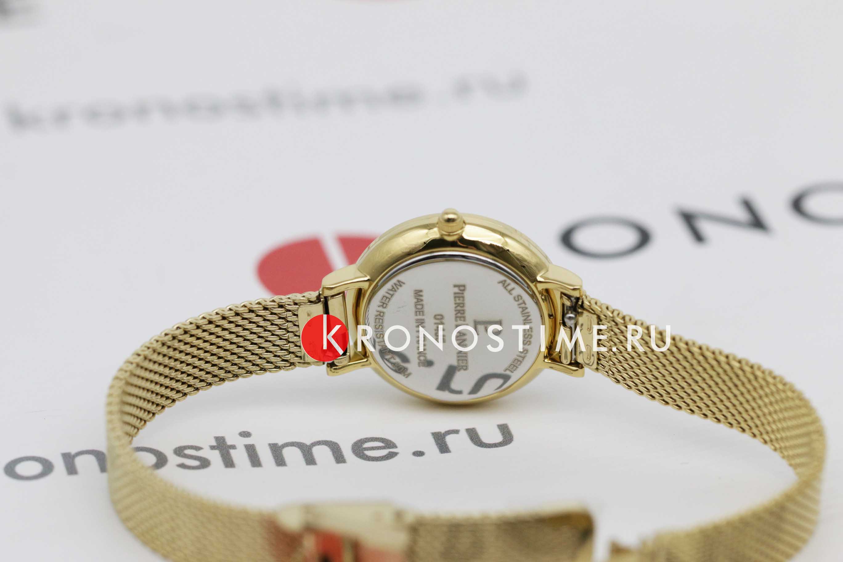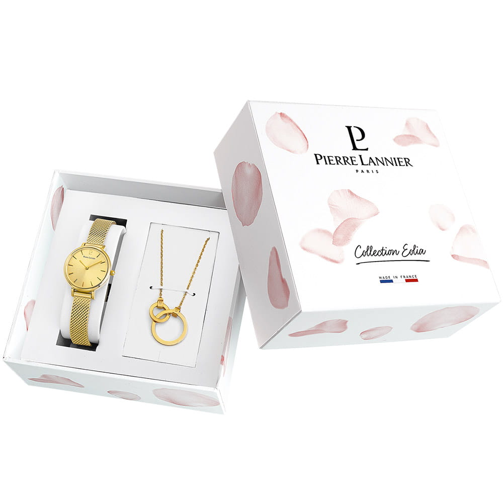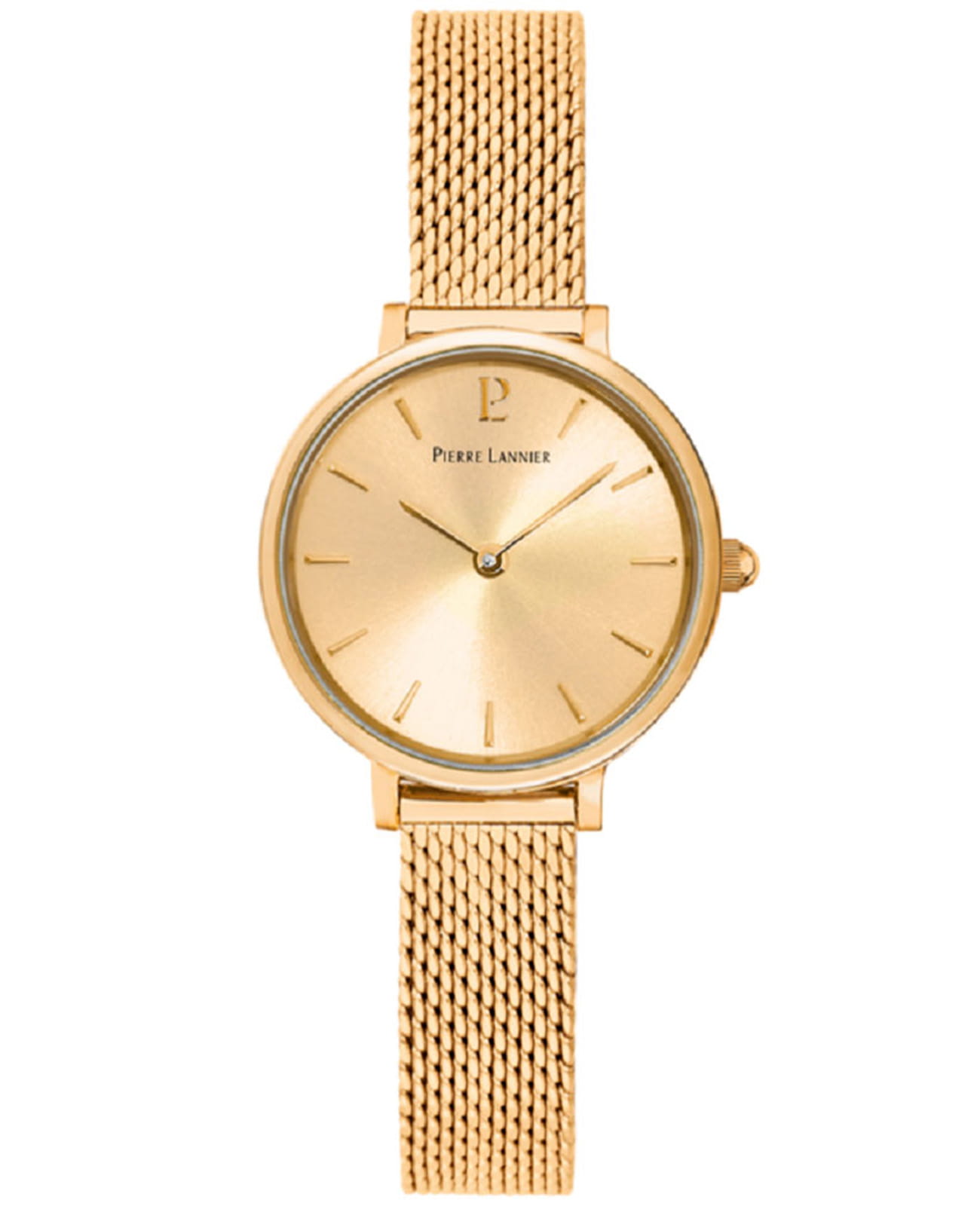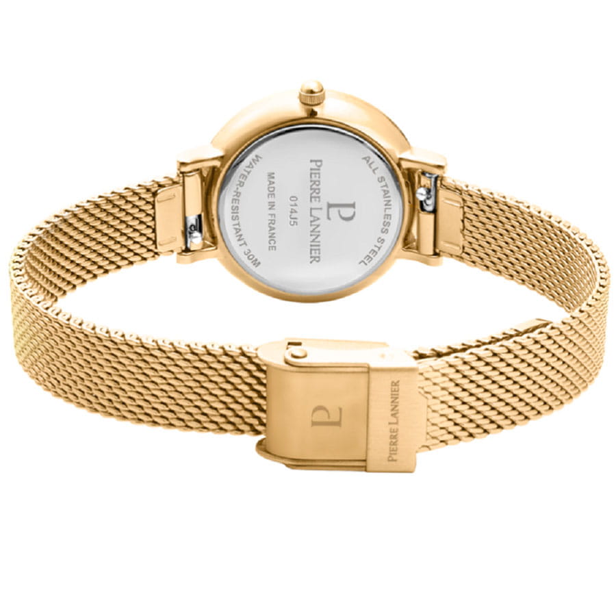 Женские кварцевые часы Pierre Lannier Nova 355D548. Центральные часовая и минутная стрелки. Золотистый циферблат. Круглый корпус выполнен из полированной нержавеющей стали с IP-покрытиемIP-покрытиеМетод ионного напыления. Демонстрирует повышенную устойчивость к истиранию, окислению и химическим веществам. Под воздействием высокого давления и температуры около 1500°C молекулы металла надёжно соединяются с частицами корпуса часов.. Стальной браслет выполнен в технике миланского плетения, раскладная застёжкаРаскладная застёжкаТакой тип застёжки используется только на браслетах из металла. Она никогда не раскрывается полностью, происходит разделение на 2 и более частей. Раскладывающая застёжка снизит вероятность потери часов к минимуму.. Прочное минеральное стеклоМинеральное стеклоМинеральное стекло представляет собой искусственно выращенный минерал кварца. Такое стекло отличается особой устойчивостью к повреждениям и царапинам. Уступает по некоторым качествам сапфировому стеклу., устойчивое к мелким механическим повреждениям. Водостойкость: 30 метров, позволит защитить корпус от случайных брызг или капель дождя.