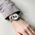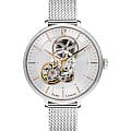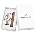 Женские механические часы с автоподзаводом Pierre Lannier Melodie 371G621. Минеральное стеклоМинеральное стеклоМинеральное стекло представляет собой искусственно выращенный минерал кварца. Такое стекло отличается особой устойчивостью к повреждениям и царапинам. Уступает по некоторым качествам сапфировому стеклу. устойчивое к мелким механическим повреждениям. Центральные часовая, минутная и секундная стрелки. Белый скелетонизированный циферблат. Корпус и браслет выполнен из нержавеющей стали. Стрелки с люминесцентным покрытиемЛюминесцентное покрытиеПозволяет считывать показания времени в темноте. Производители наносят на стрелки, часовые индексы, безель или поверхность циферблата светонакопительный состав, дающий холодное свечение.. Водостойкость: 30 метров, позволит защитить корпус от случайных брызг или капель дождя. Стальной браслет миланского плетения шириной 14 мм с раскладной застёжкойРаскладная застёжкаТакой тип застёжки используется только на браслетах из металла. Она никогда не раскрывается полностью, происходит разделение на 2 и более частей. Раскладывающая застёжка снизит вероятность потери часов к минимуму.. В комплекте коричневый кожаный ремешок.