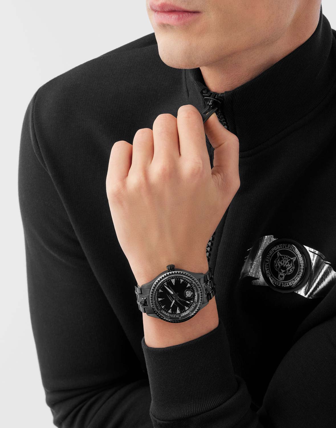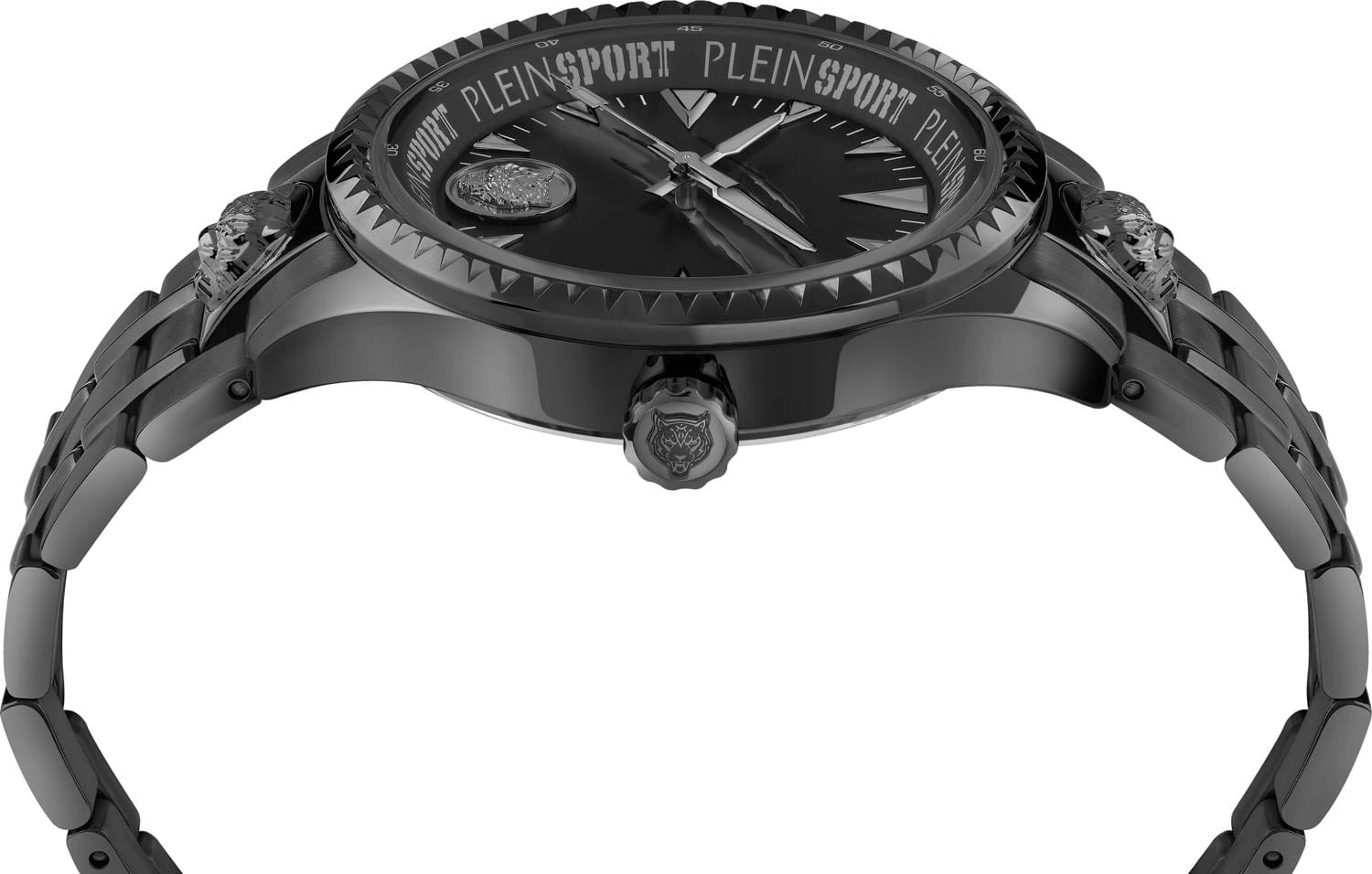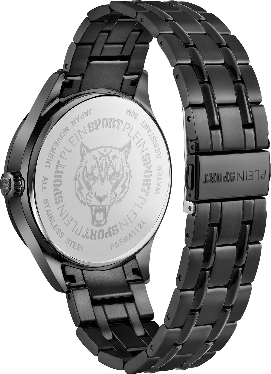 Дерзкий аксессуар со смелым, бунтарским дизайном будет с вами в любом приключении. Мужские кварцевые Plein Sport PS5BA1124 часы. Корпус часов изготовлен из стали с IP-покрытиемIP-покрытиеМетод ионного напыления. Демонстрирует повышенную устойчивость к истиранию, окислению и химическим веществам. Под воздействием высокого давления и температуры около 1500°C молекулы металла надёжно соединяются с частицами корпуса часов.. Циферблат дополнен паттерном ''след когтей''. Метки в виде штрихов, фирменное лого в виде тигра в положении 6 часов. Рифленая заводная головка с защитой. Класс водозащиты: 50 метров, позволит защитить корпус от случайных брызг или капель дождя. Стальной браслет с IP-покрытиемIP-покрытиеМетод ионного напыления. Демонстрирует повышенную устойчивость к истиранию, окислению и химическим веществам. Под воздействием высокого давления и температуры около 1500°C молекулы металла надёжно соединяются с частицами корпуса часов. на раскладной застёжкеРаскладная застёжкаТакой тип застёжки используется только на браслетах из металла. Она никогда не раскрывается полностью, происходит разделение на 2 и более частей. Раскладывающая застёжка снизит вероятность потери часов к минимуму..