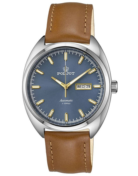 Poljot 8205.241277 — элегантные механические часы с автоподзаводом, сочетающем силу и изысканность. Корпус из нержавеющей стали подчеркивает надёжность и лаконичность дизайна, а глубокий циферблат с золотистыми стрелками придаёт модели благородный акцент. Проверенный японский механизм Miyota 8205 обеспечивает точность хода и долговечность, а плавное движение секундной стрелки подчёркивает качество сборки. Метки и стрелки с люминесцентным покрытиемЛюминесцентное покрытиеПозволяет считывать показания времени в темноте. Производители наносят на стрелки, часовые индексы, безель или поверхность циферблата светонакопительный состав, дающий холодное свечение. обеспечивают отличную читаемость при любом освещении, а окно даты добавляет практичности. Прочное минеральное стеклоМинеральное стеклоМинеральное стекло представляет собой искусственно выращенный минерал кварца. Такое стекло отличается особой устойчивостью к повреждениям и царапинам. Уступает по некоторым качествам сапфировому стеклу. защищает циферблат от царапин, а ремешок из натуральной кожи завершает утончённый облик модели. Poljot — гармония классики и современной механики, созданная для тех, кто ценит традиции и индивидуальность в каждой детали. В комплекте дополнительный ремешок с напульсником.