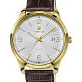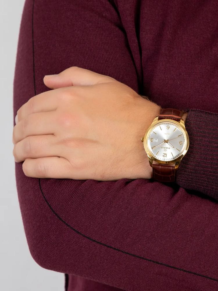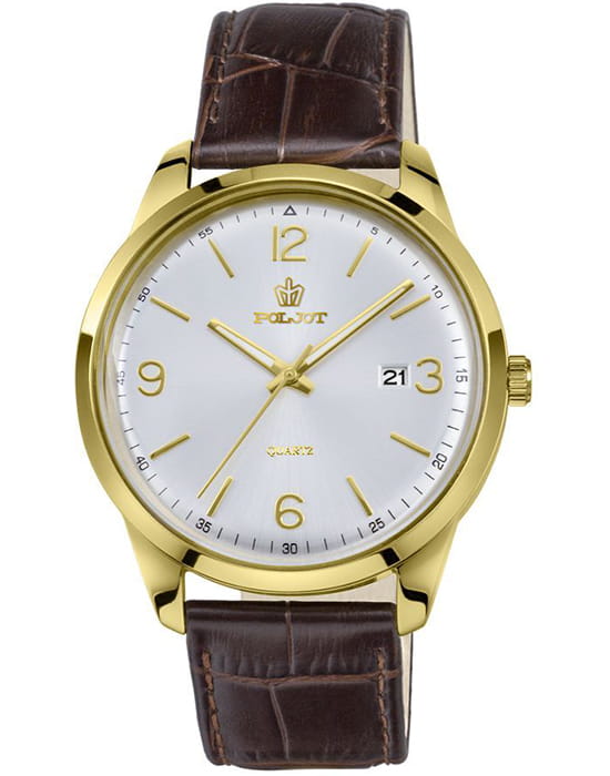 Poljot 2315.586200 — элегантные кварцевые мужские часы, объединяющие лаконичный дизайн и повседневную универсальность. Корпус из нержавеющей стали с PVD-покрытиемPVDУльтратонкое покрытие наносится в технике вакуумного напыления, сочетает в себе нитрид титана особой прочности со слоем золота или оксида хрома. Несёт в себе декоративную или защитную функцию. подчёркивает строгость линий и сдержанную эстетику, а глубокий циферблат с аккуратным гильоше и арабскими цифрами создаёт гармоничное визуальное равновесие. Тонкие золотистые стрелки с люминесцентным покрытиемЛюминесцентное покрытиеПозволяет считывать показания времени в темноте. Производители наносят на стрелки, часовые индексы, безель или поверхность циферблата светонакопительный состав, дающий холодное свечение. обеспечивают лёгкость восприятия времени, а окно даты на позиции «3 часа» добавляет практичности. Прочное минеральное стеклоМинеральное стеклоМинеральное стекло представляет собой искусственно выращенный минерал кварца. Такое стекло отличается особой устойчивостью к повреждениям и царапинам. Уступает по некоторым качествам сапфировому стеклу. защищает циферблат от мелких повреждений, а ремешок из натуральной кожи с фактурой крокодила обеспечивает комфорт и элегантное прилегание к запястью. Poljot — это часы для мужчин, ценящих точность, простоту и утончённый повседневный стиль.