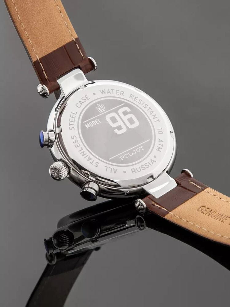 Poljot 6S21.961227 “Baikal” — элегантные кварцевые мужские часы, в которых классическая строгость сочетается с выразительным российским характером. Корпус из нержавеющей стали с крупными декоративными ушками придаёт модели солидность и узнаваемость, а глубокий циферблат с контрастными стрелками и индексами с люминесцентным покрытиемЛюминесцентное покрытиеПозволяет считывать показания времени в темноте. Производители наносят на стрелки, часовые индексы, безель или поверхность циферблата светонакопительный состав, дающий холодное свечение. подчёркивает точность и функциональность. Два дополнительных счётчика хронографаХронографФункция позволяет измерять отрезки времени с особой точностью: часы, минуты, секунды. Верным признаком хронографа является наличие на циферблате 3 дополнительных окошек-счётчиков. обеспечивают измерение времени с высокой точностью, а окно даты добавляет практичности. Прочное минеральное стеклоМинеральное стеклоМинеральное стекло представляет собой искусственно выращенный минерал кварца. Такое стекло отличается особой устойчивостью к повреждениям и царапинам. Уступает по некоторым качествам сапфировому стеклу. защищает циферблат от царапин, а ремешок из натуральной кожи с классической пряжкой гарантирует комфорт и надёжную фиксацию на запястье. Poljot “Baikal” — это сочетание традиций, надёжности и уверенного стиля, созданное для мужчин, ценящих точность и благородную сдержанность.