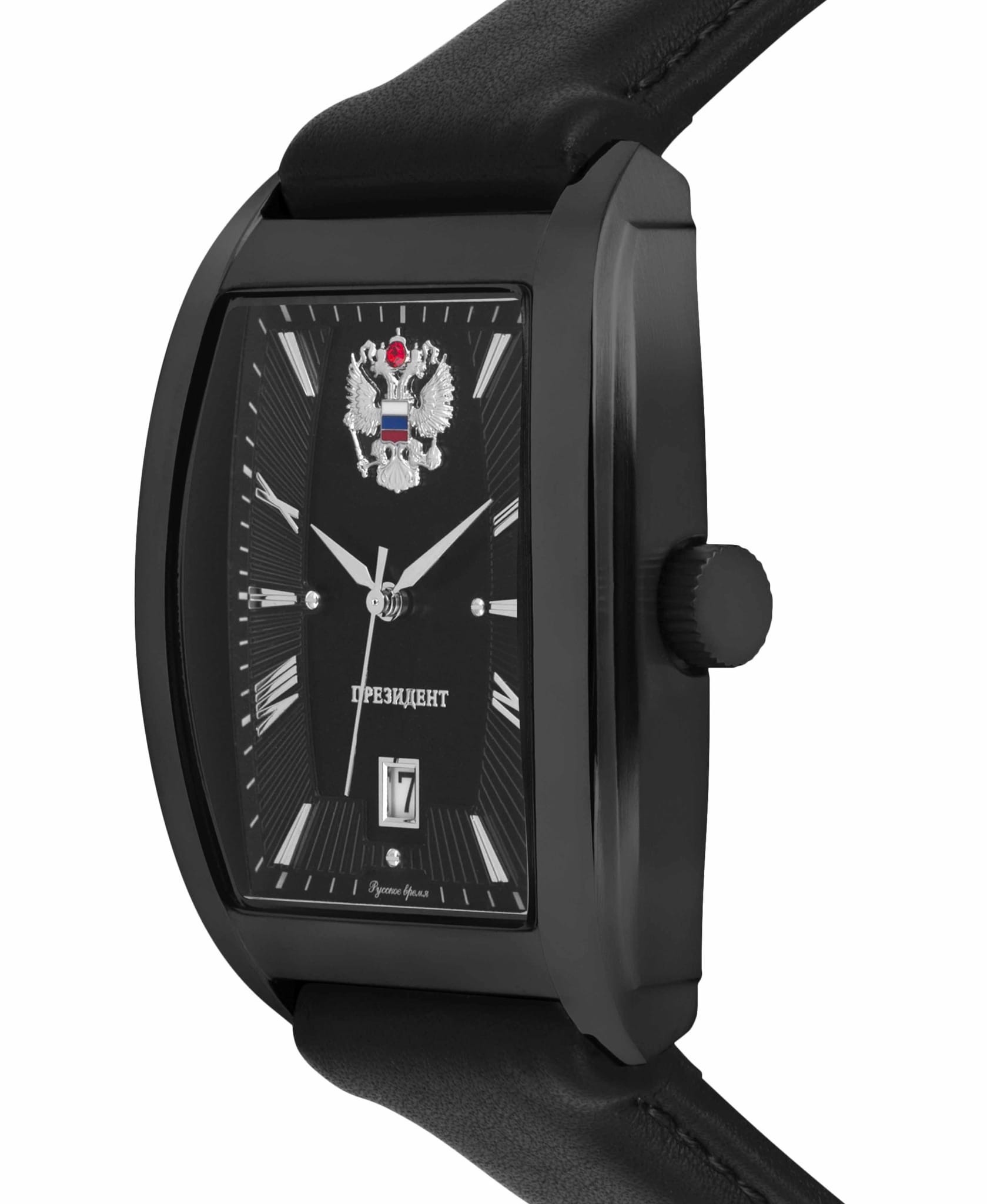 Мужские кварцевые часы из коллекции Президент — это сочетание строгого дизайна и надёжности. Корпус прямоугольной формы выполнен в цвете чёрный хром и защищён минеральным стекломМинеральное стеклоМинеральное стекло представляет собой искусственно выращенный минерал кварца. Такое стекло отличается особой устойчивостью к повреждениям и царапинам. Уступает по некоторым качествам сапфировому стеклу.. Циферблат дополнен окошком даты, расположенным на отметке 3 часа. Часы оснащены кожаным ремешком, который обеспечивает комфорт при ношении. Механизм — японский кварцевый Miyota, гарантирующий точное отсчёт времени. Водонепроницаемость 30 м позволяет использовать часы в повседневных условиях, защищая от случайных брызг и капель дождя. Комплектация включает подарочный футляр, паспорт с гарантийным талоном и фирменный пакет. Гарантия — 24 месяца.