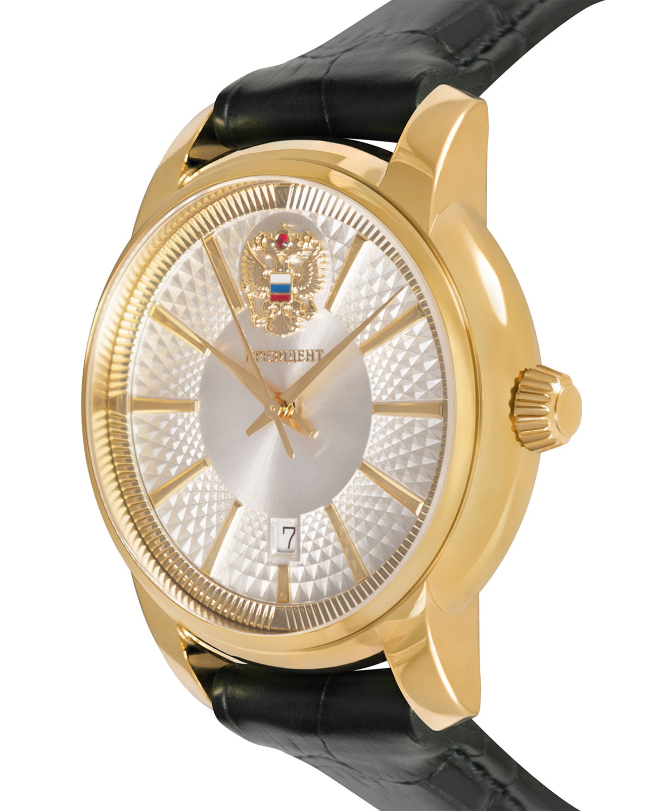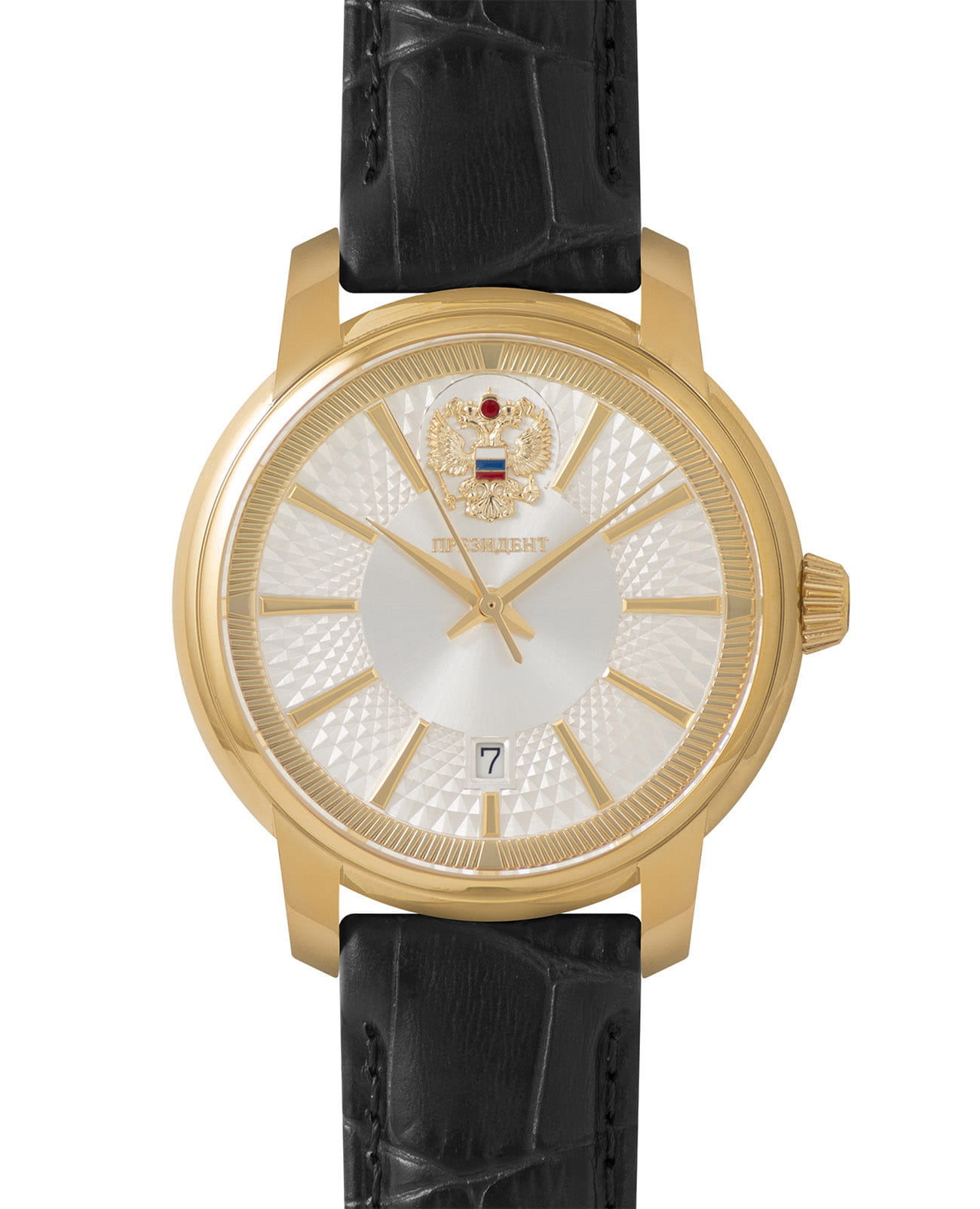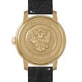 Мужские часы из коллекции «Президент» — это стильный аксессуар, выполненный в желтом золоте и сочетающий в себе элегантность и точность. Модель имеет круглый корпус диаметром 42,9 мм и толщиной 13,7 мм, защищённый сапфировым стекломСапфировое стеклоПрочный и надёжный материал из кристалла сапфира синтетического происхождения, характеризующийся особой твёрдостью и устойчивостью к царапинам и повреждениям., устойчивым к царапинам и механическим повреждениям. Циферблат украшен контуром русской матрешки и инкрустирован кристаллами Swarovski, что придаёт модели особую привлекательность и изысканность. Часы оснащены механизмом с автоподзаводом, обеспечивающим надёжную работу без необходимости частой подзаводки. Задняя крышка с чеканкой Герба России подчёркивает национальную принадлежность и уникальность модели. Кожаный ремешок шириной 20 мм дополнен классической застёжкой, обеспечивая комфорт и элегантный образ. Часы водонепроницаемы до 30 метров (), что позволяет использовать их в повседневных условиях — при мытье рук или под лёгким дождём. Эти часы станут универсальным аксессуаром для тех, кто ценит сочетание стиля, качества и символики — идеальный выбор для уверенных в себе мужчин, следящих за своим имиджем и предпочитающих выделяться.