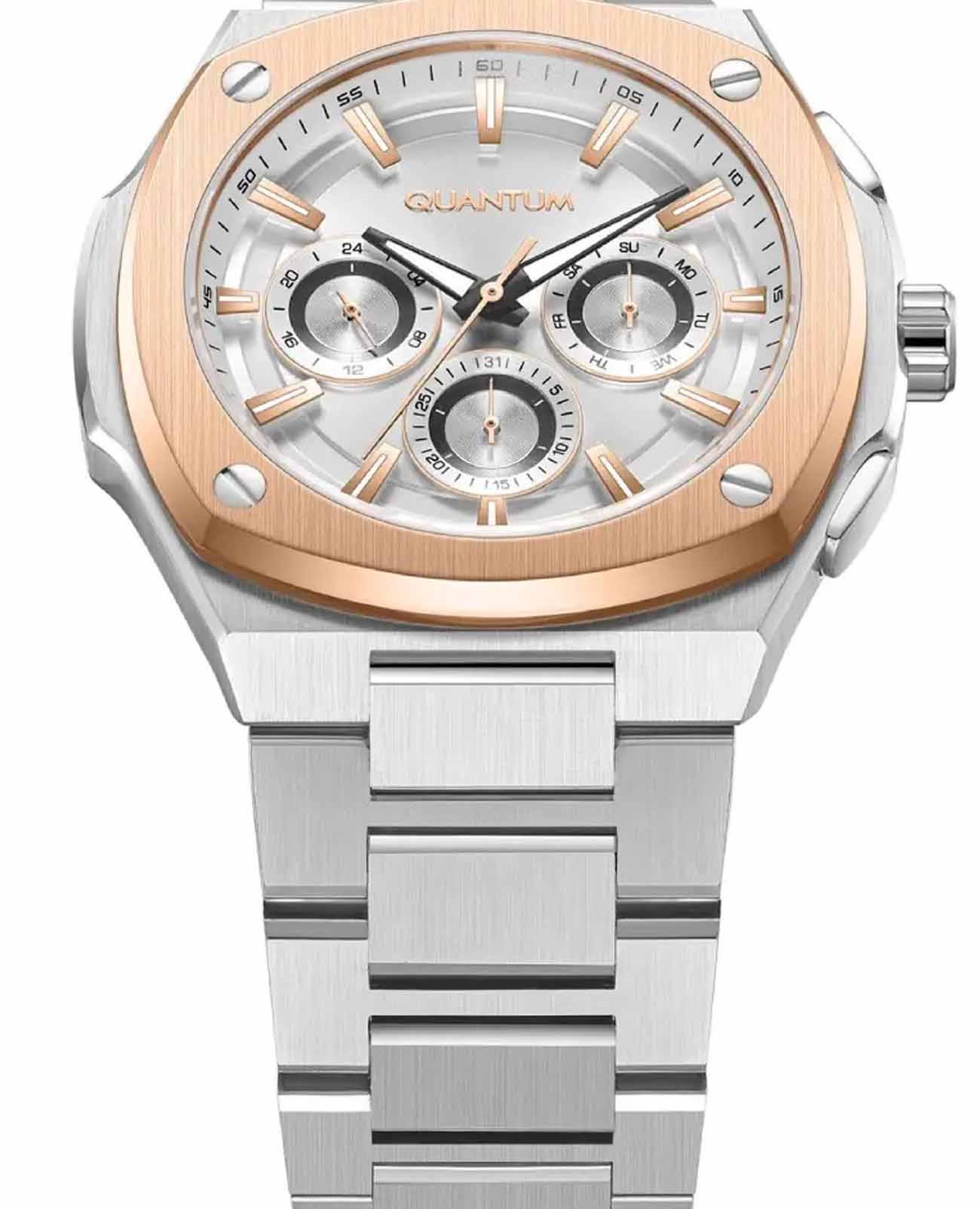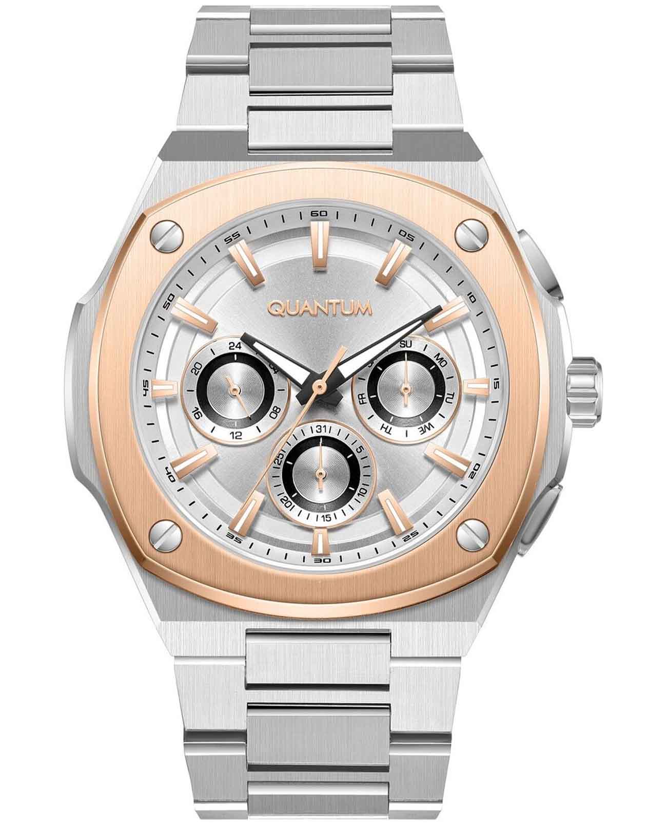 Мужские часы Quantum ADG1032.530, кварцевый механизм с высокой точностью. Класс водозащиты: 100 метров, позволит плавать, нырять и заниматься другими водными видами спорта. Корпус и браслет часов изготовлены из стали. Стальной браслет на раскладной застёжкеРаскладная застёжкаТакой тип застёжки используется только на браслетах из металла. Она никогда не раскрывается полностью, происходит разделение на 2 и более частей. Раскладывающая застёжка снизит вероятность потери часов к минимуму.. Стрелки с люминесцентным покрытиемЛюминесцентное покрытиеПозволяет считывать показания времени в темноте. Производители наносят на стрелки, часовые индексы, безель или поверхность циферблата светонакопительный состав, дающий холодное свечение.. На малых циферблатах отображается день недели и текущее время в 24-х часовом формате. БезельБезельВнешний ободок, закрепляющий стекло. В спортивных часах так называется поворотное кольцо с делениями на циферблате, выполняет роль таймера – замеряет отрезки времени на шкале. Неподвижный безель – элемент декора. Однонаправленно вращающийся безель на дайверских часах позволяет фиксировать моменты погружения и выныривания на поверхность. с IP-покрытиемIP-покрытиеМетод ионного напыления. Демонстрирует повышенную устойчивость к истиранию, окислению и химическим веществам. Под воздействием высокого давления и температуры около 1500°C молекулы металла надёжно соединяются с частицами корпуса часов..