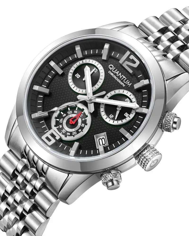 Мужские кварцевые часы Quantum ADG1173.350 из коллекции Adrenaline — надёжный и стильный спортивный аксессуар для повседневного ношения. Корпус круглый, из нержавеющей стали, диаметром 43 мм. Циферблат — чёрный со штриховыми метками. Стекло — минеральноеМинеральное стеклоМинеральное стекло представляет собой искусственно выращенный минерал кварца. Такое стекло отличается особой устойчивостью к повреждениям и царапинам. Уступает по некоторым качествам сапфировому стеклу.. Стрелки и метки с люминесцентным покрытиемЛюминесцентное покрытиеПозволяет считывать показания времени в темноте. Производители наносят на стрелки, часовые индексы, безель или поверхность циферблата светонакопительный состав, дающий холодное свечение.. Функции: хронографХронографФункция позволяет измерять отрезки времени с особой точностью: часы, минуты, секунды. Верным признаком хронографа является наличие на циферблате 3 дополнительных окошек-счётчиков., секундомер, окошко даты. Водонепроницаемость 100 м. Браслет — стальной на раскладной застёжкеРаскладная застёжкаТакой тип застёжки используется только на браслетах из металла. Она никогда не раскрывается полностью, происходит разделение на 2 и более частей. Раскладывающая застёжка снизит вероятность потери часов к минимуму.. Идеальный выбор для тех, кто ценит турецкий дизайн и повседневную функциональность.