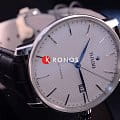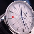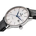 Лаконичный белый циферблат имеет оригинальный узор, такое исполнение привнесёт в классический стиль строгого пиджака долю эксклюзивности. В качестве цветового акцента используются яркие синие стрелки. Наручные часы с автоподзаводом имеют швейцарский калибр ETA C07.611, сохраняющий запас хода на 80 часов. Стекло из сапфира с антибликовым покрытием. Чёрный ремешок из натуральной кожи. Диаметр корпуса: 41 мм.