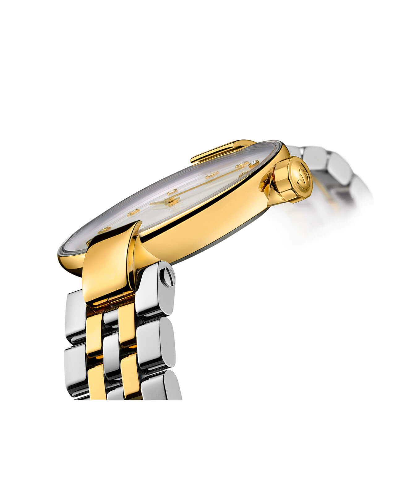 Премиальная модель будет элегантным дополнением как к деловому костюму, как и к повседневному наряду. Компактный перламутровый циферблат декорирован 12 сияющими бриллиантами в 0,038 карат, акцент сделан на необычных тонких ушках, соединяющих браслет и корпус. Высокоточный кварцевый механизм ETA 280.002. Частичное PVD-покрытиеPVDУльтратонкое покрытие наносится в технике вакуумного напыления, сочетает в себе нитрид титана особой прочности со слоем золота или оксида хрома. Несёт в себе декоративную или защитную функцию. цвета жёлтого золота. Выпуклое сапфировое стекло Водонепроницаемость 50 метров. . Диаметр корпуса: 27 мм.