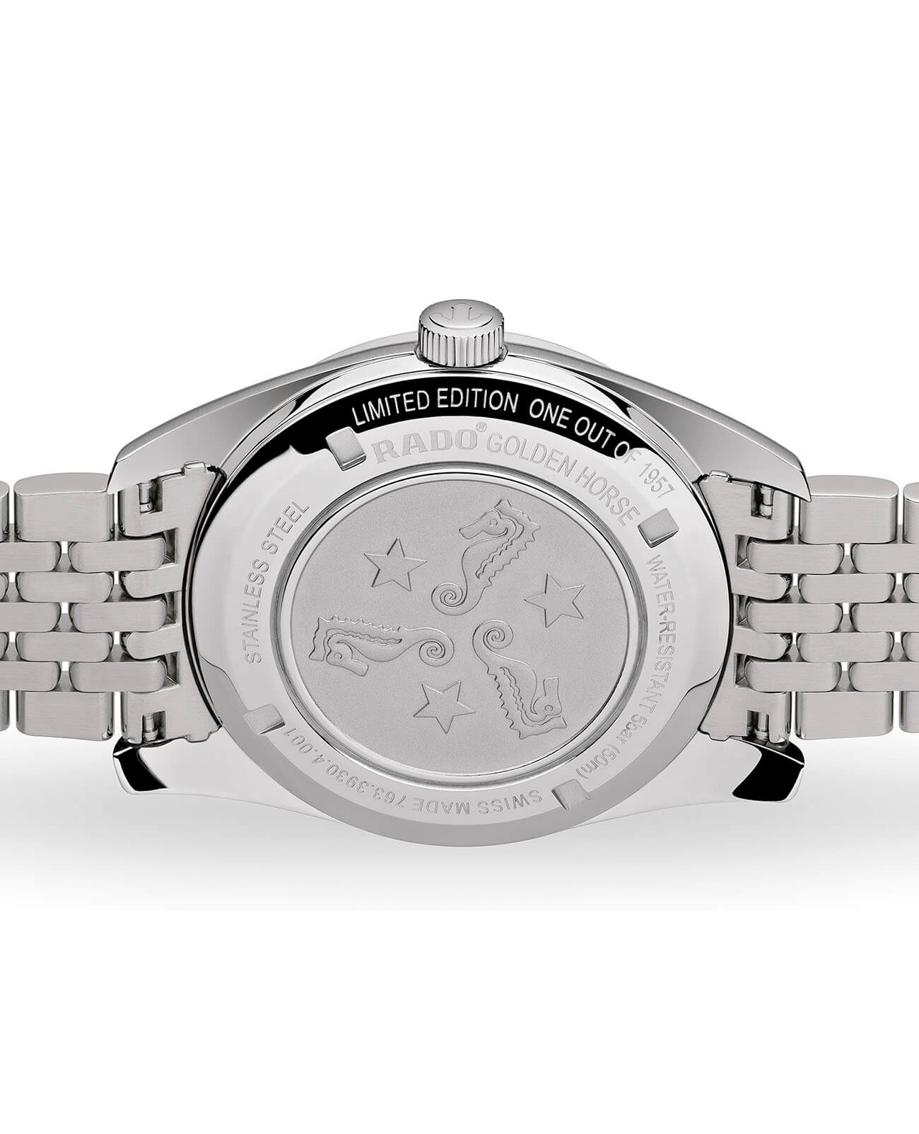 Модель относится к премиальному сегменту, стильно смотрится чёрный узорчатый циферблат с контрастными элементами. Нижняя часть дополнена эмблемой в виде морских коньков, в верхней находится узнаваемый логотип Rado. Часы сделаны из нержавеющей стали 316L, как и первые аксессуары из линейки Golden Horse. Корпус защищает автоматический механизм ETA C07.611 с резервом хода 80 часов от ударов и повреждений. Задняя крышка имеет отличительную гравировку. Сапфировое стекло с покрытием «антиблик». Водостойкость до 5 бар. Отображение текущего числа. Диаметр корпуса: 36,5 мм.