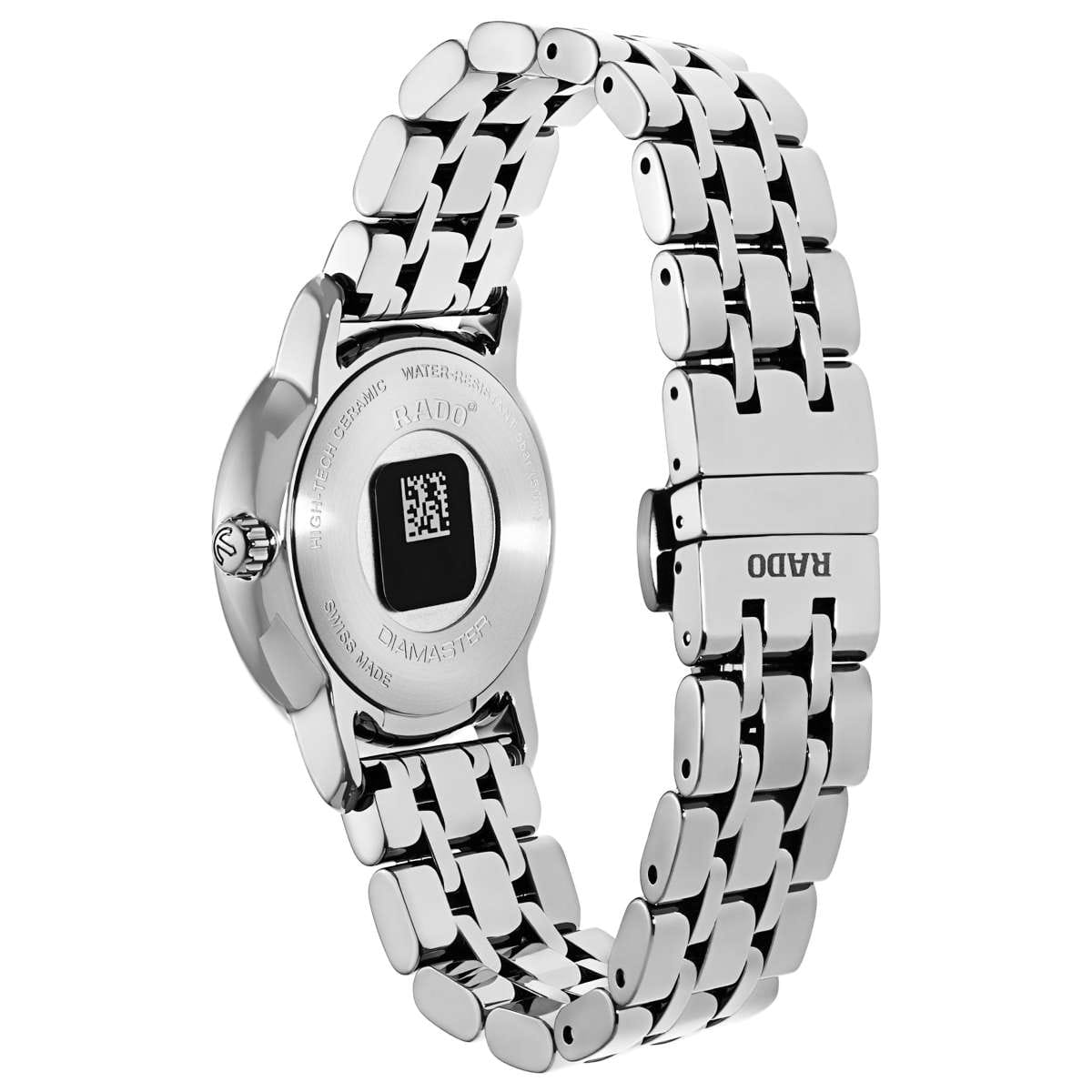 Женские швейцарские часы Rado Coupole R14064707. Корпус и браслет часов изготовлены из высокотехнологичной плазменной керамикиВысокотехнологичная плазменная керамикаИнновационный материал, технология запатентована. Выплавление керамики осуществляется в печи при 20 000 °C, белоснежный материал под воздействием ультравысокой температуры приобретает уникальный блеск, присущий металлам.. Сапфировое стеклоСапфировое стеклоПрочный и надёжный материал из кристалла сапфира синтетического происхождения, характеризующийся особой твёрдостью и устойчивостью к царапинам и повреждениям. устойчивое к мелким механическим повреждениям. Браслет на раскладной застёжкойРаскладная застёжкаТакой тип застёжки используется только на браслетах из металла. Она никогда не раскрывается полностью, происходит разделение на 2 и более частей. Раскладывающая застёжка снизит вероятность потери часов к минимуму.. Класс водозащиты: 50 метров, позволит защитить корпус от случайных брызг или капель дождя. Окошко даты находится в положении 6 часов. Циферблат с метками в виде штрихов и римской цифры, украшен бриллиантами.