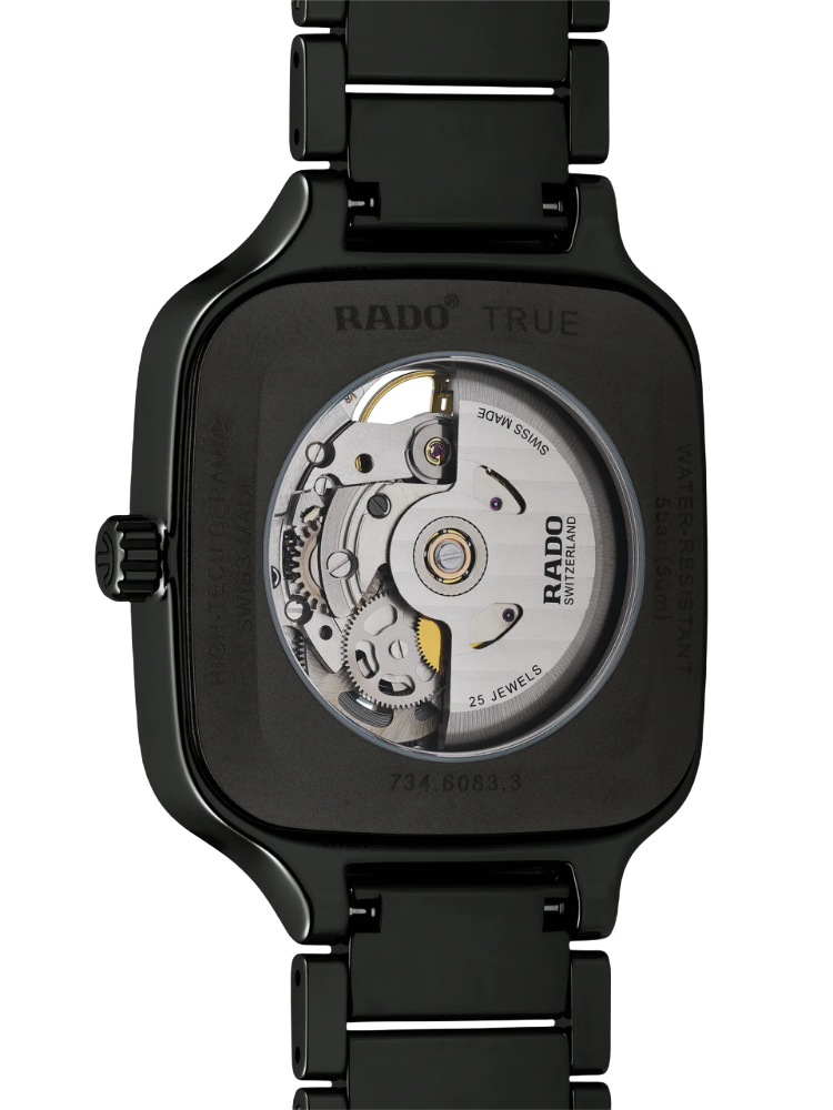 Швейцарские механические часы с автоподзаводом Rado True Square Automatic Open Heart R27086162. True Square - это новый взгляд на культовую форму Rado. Первые часы True Square, изготовленные с использованием моноблочного высокотехнологичного керамическогоВысокотехнологичная керамикаИнновационный запатентованный Rado материал с гладкой или матовой поверхностью. Керамика за счёт кристаллической структуры обладает повышенной устойчивостью от возникновения царапин. Материал способен принимать температуру тела человека, обеспечивая невероятный комфорт при ношении. корпуса квадратной формы, легкие, устойчивые к царапинам и удобные в носке. Швейцарский автоматический механизм отличается резервом хода на 80 часов. Стрелки и метки дополнены ярким люминесцентным покрытиемЛюминесцентное покрытиеПозволяет считывать показания времени в темноте. Производители наносят на стрелки, часовые индексы, безель или поверхность циферблата светонакопительный состав, дающий холодное свечение.. Класс водозащиты: 50 метров, позволит защитить корпус от случайных брызг или капель дождя. Браслет из высокотехнологичной керамикиВысокотехнологичная керамикаИнновационный запатентованный Rado материал с гладкой или матовой поверхностью. Керамика за счёт кристаллической структуры обладает повышенной устойчивостью от возникновения царапин. Материал способен принимать температуру тела человека, обеспечивая невероятный комфорт при ношении. на застёжке-бабочкеЗастёжка "бабочка"Такой вид застёжки дополняется предохранителями, помогающими избежать случайного раскрытия браслета. Обладают изящным исполнением. .
