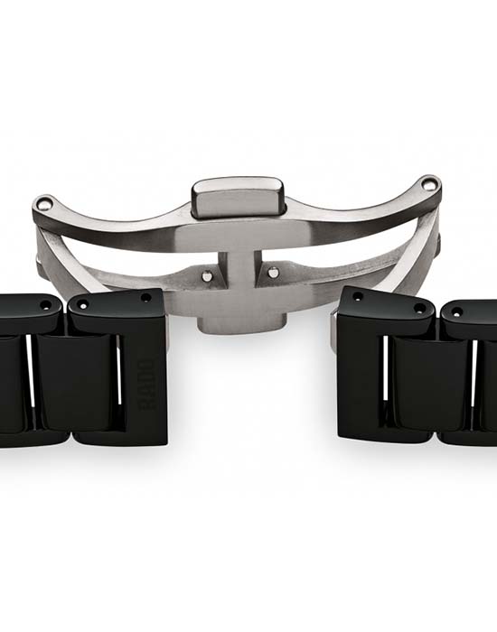 Браслет часов выполнен из титана и высокотехнологичной керамикиВысокотехнологичная керамикаИнновационный запатентованный Rado материал с гладкой или матовой поверхностью. Керамика за счёт кристаллической структуры обладает повышенной устойчивостью от возникновения царапин. Материал способен принимать температуру тела человека, обеспечивая невероятный комфорт при ношении., что придаёт им дополнительную прочность и комфорт при ношении. Застёжка выполнена в виде «бабочки»Застёжка "бабочка"Такой вид застёжки дополняется предохранителями, помогающими избежать случайного раскрытия браслета. Обладают изящным исполнением. , что обеспечивает удобную и надёжную фиксацию на запястье.