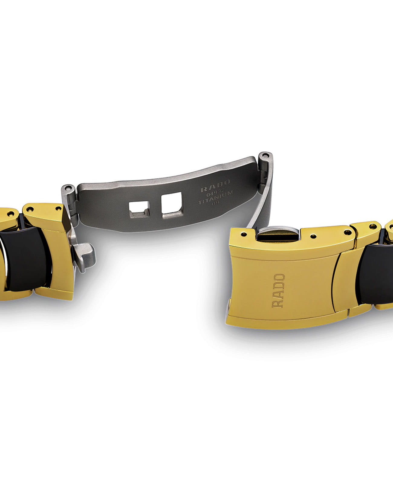 Швейцарские женские механические часы с автоподзаводом Rado Centrix R30034712. Сапфировое стеклоСапфировое стеклоПрочный и надёжный материал из кристалла сапфира синтетического происхождения, характеризующийся особой твёрдостью и устойчивостью к царапинам и повреждениям. устойчивое к мелким механическим повреждениям. Корпус часов изготовлен из нержавеющей стали с PVD-покрытиемPVDУльтратонкое покрытие наносится в технике вакуумного напыления, сочетает в себе нитрид титана особой прочности со слоем золота или оксида хрома. Несёт в себе декоративную или защитную функцию.. БезельБезельВнешний ободок, закрепляющий стекло. В спортивных часах так называется поворотное кольцо с делениями на циферблате, выполняет роль таймера – замеряет отрезки времени на шкале. Неподвижный безель – элемент декора. Однонаправленно вращающийся безель на дайверских часах позволяет фиксировать моменты погружения и выныривания на поверхность. из керамики. Окошко даты находится в положении 3 часа. Циферблат украшен бриллиантами. Класс водозащиты: 30 метров, позволит защитить корпус от случайных брызг или капель дождя. Браслет нержавеющей стали с PVD-покрытиемPVDУльтратонкое покрытие наносится в технике вакуумного напыления, сочетает в себе нитрид титана особой прочности со слоем золота или оксида хрома. Несёт в себе декоративную или защитную функцию. и высокотехнологичной плазменной керамикиВысокотехнологичная плазменная керамикаИнновационный материал, технология запатентована. Выплавление керамики осуществляется в печи при 20 000 °C, белоснежный материал под воздействием ультравысокой температуры приобретает уникальный блеск, присущий металлам. на раскладной застёжкеРаскладная застёжкаТакой тип застёжки используется только на браслетах из металла. Она никогда не раскрывается полностью, происходит разделение на 2 и более частей. Раскладывающая застёжка снизит вероятность потери часов к минимуму..