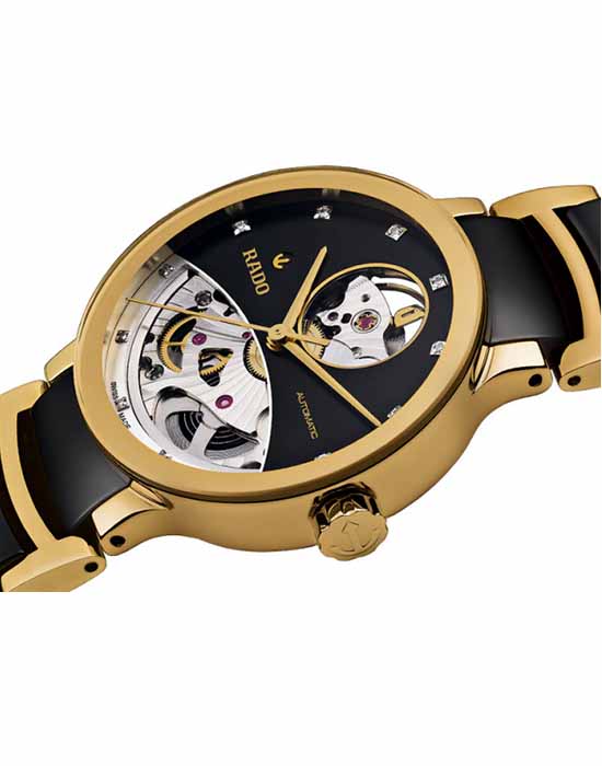 Швейцарские механические часы-скелетоны с автоподзаводом Rado Centrix Automatic Diamonds Open Heart R30246712. Сапфировое стеклоСапфировое стеклоПрочный и надёжный материал из кристалла сапфира синтетического происхождения, характеризующийся особой твёрдостью и устойчивостью к царапинам и повреждениям. устойчивое к мелким механическим повреждениям. Корпус часов изготовлен из нержавеющей стали с PVD-покрытиемPVDУльтратонкое покрытие наносится в технике вакуумного напыления, сочетает в себе нитрид титана особой прочности со слоем золота или оксида хрома. Несёт в себе декоративную или защитную функцию.. Класс водозащиты: 30 метров, позволит защитить корпус от случайных брызг или капель дождя. Браслет из стали PVD-покрытиемPVDУльтратонкое покрытие наносится в технике вакуумного напыления, сочетает в себе нитрид титана особой прочности со слоем золота или оксида хрома. Несёт в себе декоративную или защитную функцию. и высокотехнологичной керамикиВысокотехнологичная керамикаИнновационный запатентованный Rado материал с гладкой или матовой поверхностью. Керамика за счёт кристаллической структуры обладает повышенной устойчивостью от возникновения царапин. Материал способен принимать температуру тела человека, обеспечивая невероятный комфорт при ношении. на раскладной застёжкеРаскладная застёжкаТакой тип застёжки используется только на браслетах из металла. Она никогда не раскрывается полностью, происходит разделение на 2 и более частей. Раскладывающая застёжка снизит вероятность потери часов к минимуму..