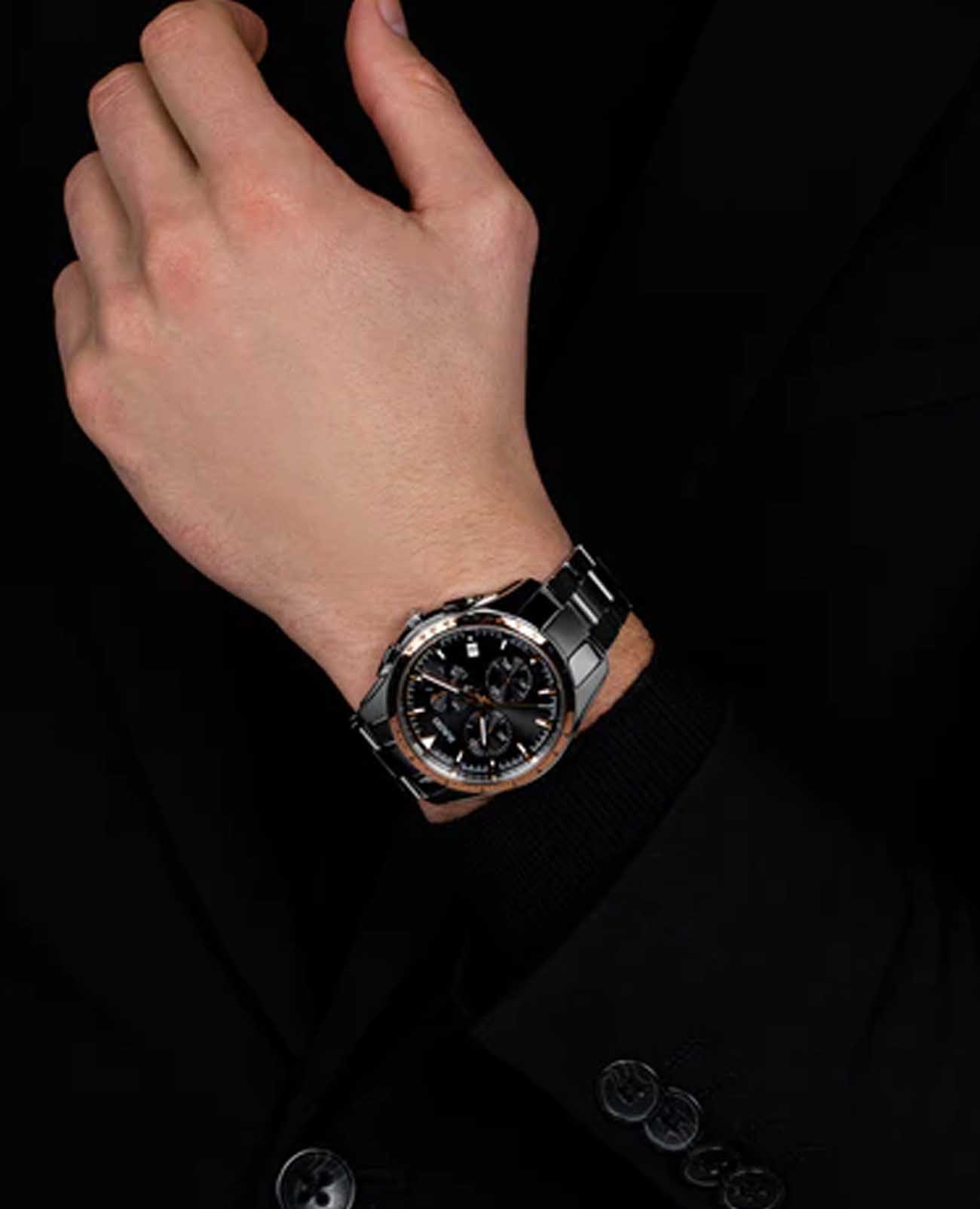 Швейцарские кварцевые часы- хронографХронографФункция позволяет измерять отрезки времени с особой точностью: часы, минуты, секунды. Верным признаком хронографа является наличие на циферблате 3 дополнительных окошек-счётчиков. Rado Hyperchrome Chronograph R32259163. Сапфировое стеклоСапфировое стеклоПрочный и надёжный материал из кристалла сапфира синтетического происхождения, характеризующийся особой твёрдостью и устойчивостью к царапинам и повреждениям. устойчивое к мелким механическим повреждениям. Корпус изготовлен из нержавеющей стали. БезельБезельВнешний ободок, закрепляющий стекло. В спортивных часах так называется поворотное кольцо с делениями на циферблате, выполняет роль таймера – замеряет отрезки времени на шкале. Неподвижный безель – элемент декора. Однонаправленно вращающийся безель на дайверских часах позволяет фиксировать моменты погружения и выныривания на поверхность. из высокотехнологичной керамикиВысокотехнологичная керамикаИнновационный запатентованный Rado материал с гладкой или матовой поверхностью. Керамика за счёт кристаллической структуры обладает повышенной устойчивостью от возникновения царапин. Материал способен принимать температуру тела человека, обеспечивая невероятный комфорт при ношении.. Класс водозащиты: 100 метров, позволит плавать, нырять и заниматься другими водными видами спорта. Браслет из стали на раскладной застёжкеРаскладная застёжкаТакой тип застёжки используется только на браслетах из металла. Она никогда не раскрывается полностью, происходит разделение на 2 и более частей. Раскладывающая застёжка снизит вероятность потери часов к минимуму..